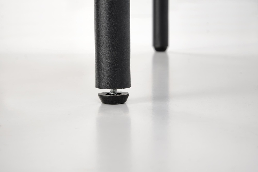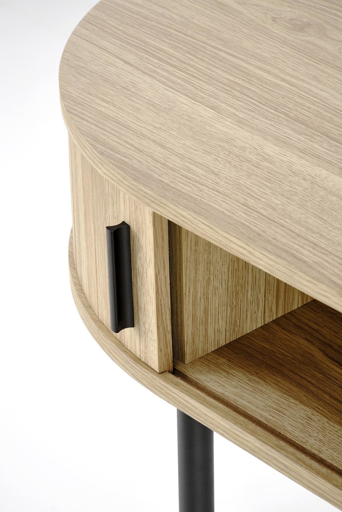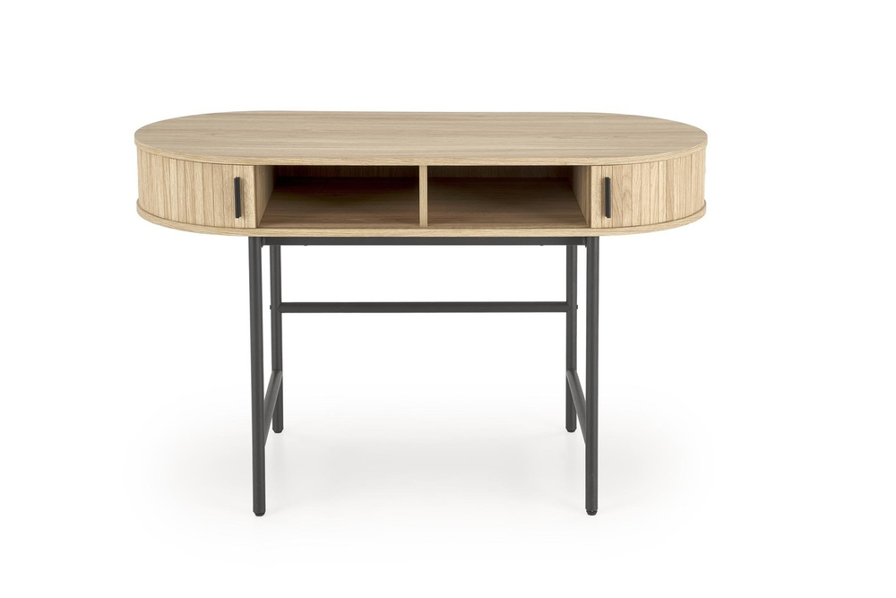 Blat i korpus wykonano z MDF okleinowanego w naturalnym odcieniu, który pięknie eksponuje usłojenie drewna. Smukły, czarny stelaż z malowanej proszkowo stali nadaje konstrukcji stabilność i lekkość. Biurko o wymiarach 120 × 55 × 75 cm wyposażono w dyskretne szafki boczne z pionowym ryflowaniem oraz otwarte wnęki, które ułatwiają przechowywanie i organizację przestrzeni roboczej.