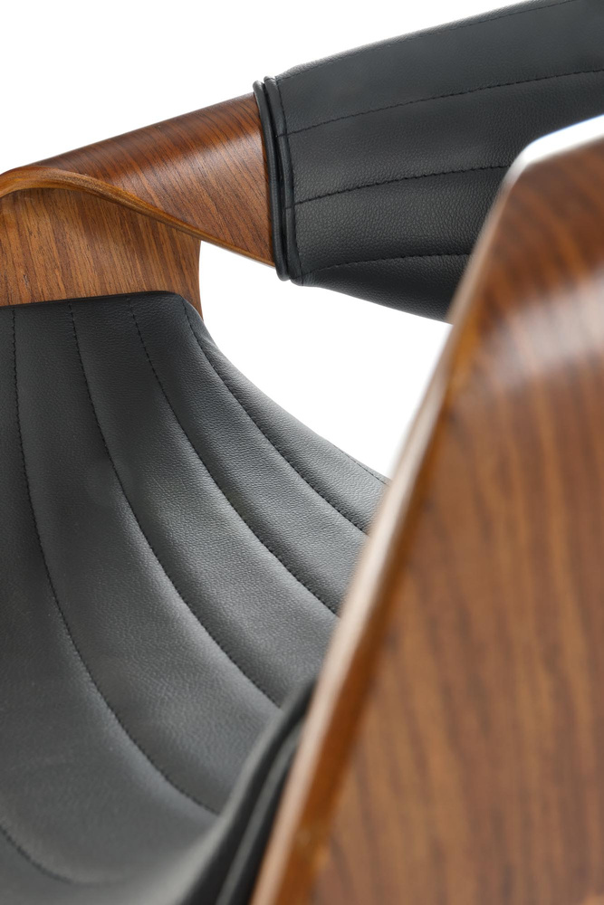 H123 to hoker, który łączy design lat 60. z nowoczesną funkcjonalnością. Jego charakterystyczne, opływowe kształty, połączenie czarnej eco skóry i giętej sklejki w kolorze orzecha oraz chromowane detale tworzą mebel, który przyciąga spojrzenia i nadaje wnętrzu wyjątkowy klimat.