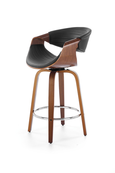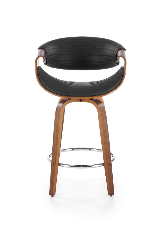Bazą hokera jest gięta sklejka, która zachwyca naturalnym usłojeniem w odcieniu orzechowego drewna. To właśnie ten element nadaje konstrukcji ponadczasowy charakter. Siedzisko i oparcie tapicerowane miękką eco skórą w głębokim kolorze czerni nie tylko wyglądają stylowo, ale są też wyjątkowo wygodne. Całość wieńczy chromowany podnóżek, który dodaje lekkości i ułatwia komfortowe siedzenie.