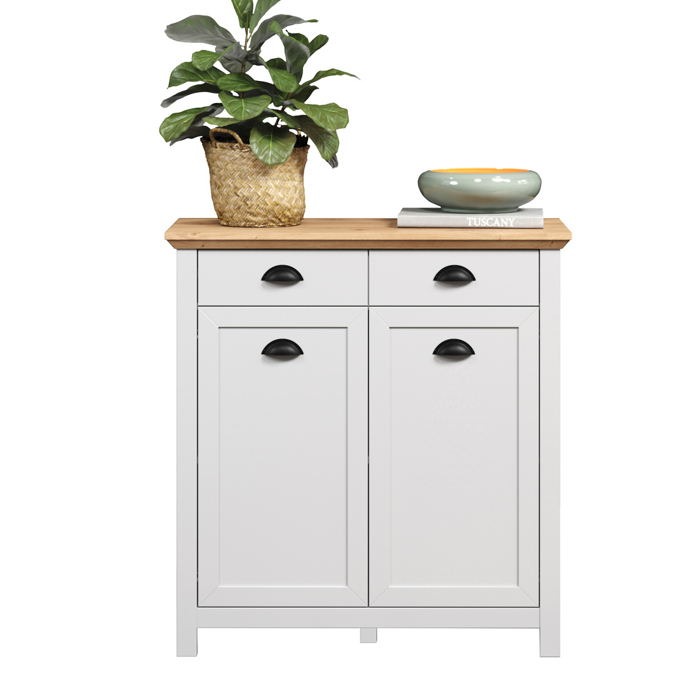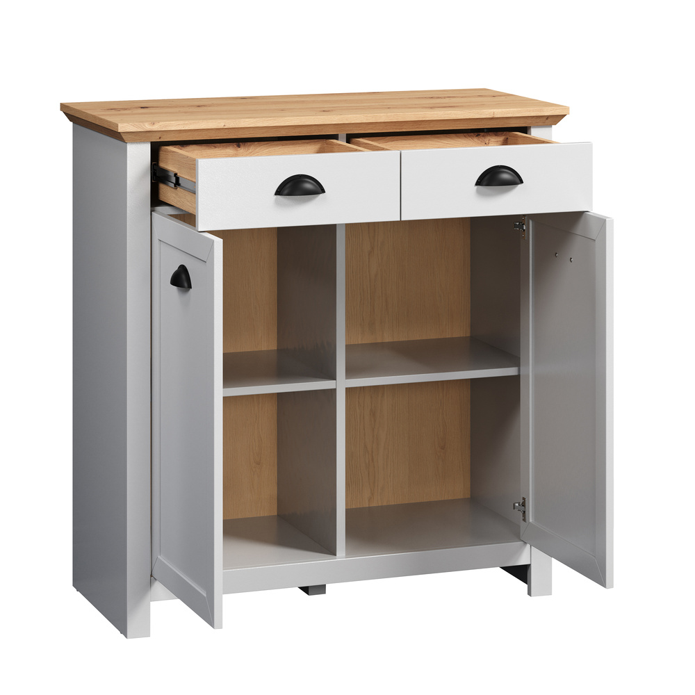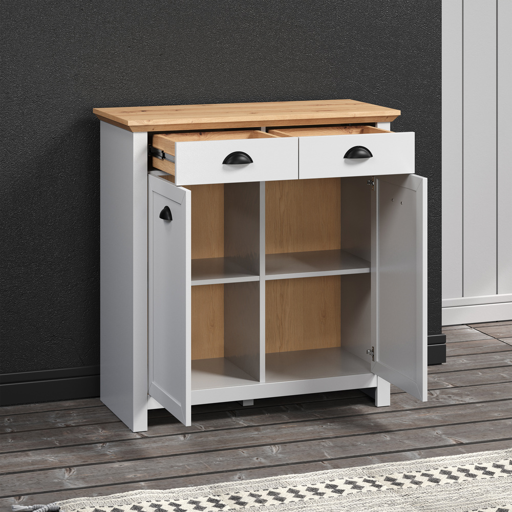 Model wyposażony jest w dwie praktyczne szuflady – idealne na drobiazgi, takie jak klucze, rękawiczki czy dokumenty – oraz dwie pojemne szafki z półkami, które pomieszczą obuwie, torby lub akcesoria sezonowe. Dzięki wysokości 95 cm blat komody można wykorzystać jako miejsce do ekspozycji dekoracji lub dodatkową przestrzeń do odkładania kluczy.