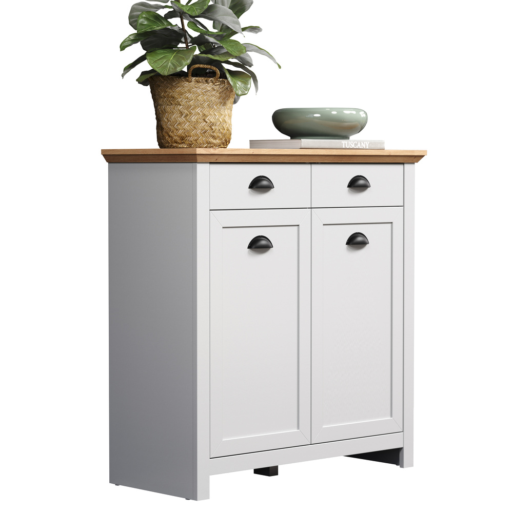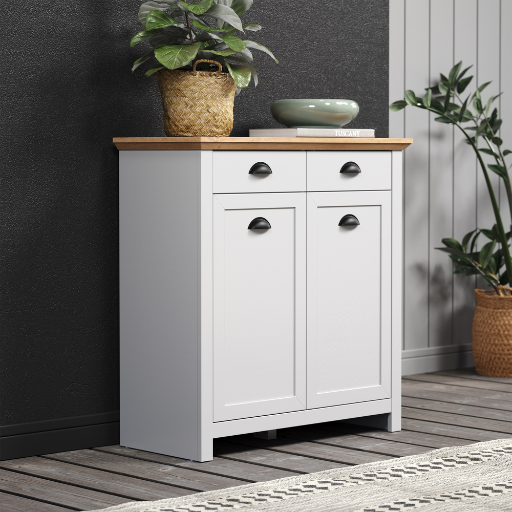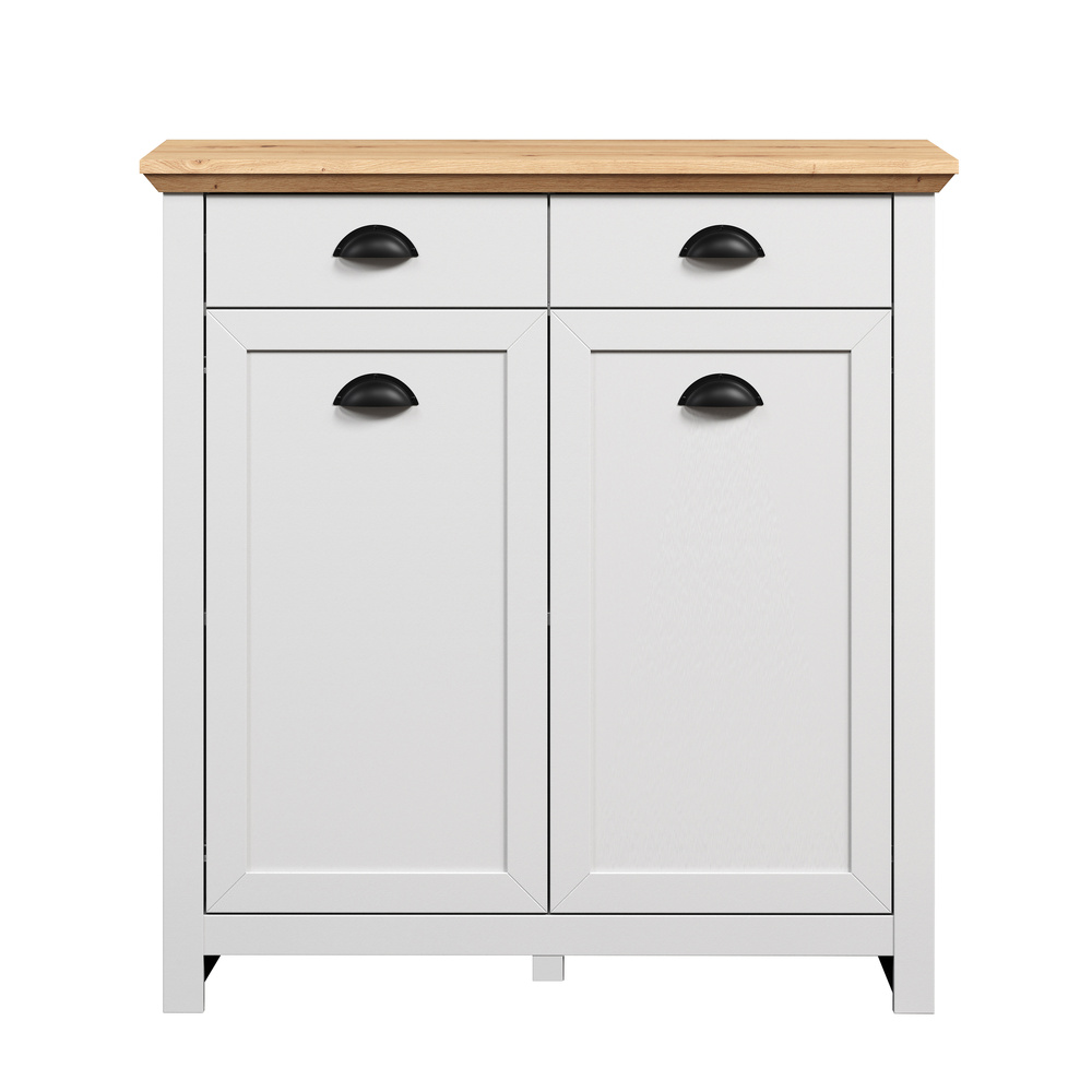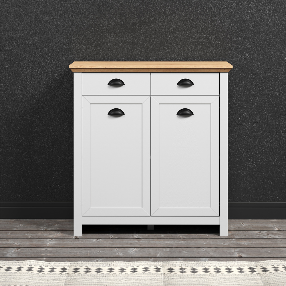 Model wyposażony jest w dwie praktyczne szuflady – idealne na drobiazgi, takie jak klucze, rękawiczki czy dokumenty – oraz dwie pojemne szafki z półkami, które pomieszczą obuwie, torby lub akcesoria sezonowe. Dzięki wysokości 95 cm blat komody można wykorzystać jako miejsce do ekspozycji dekoracji lub dodatkową przestrzeń do odkładania kluczy.