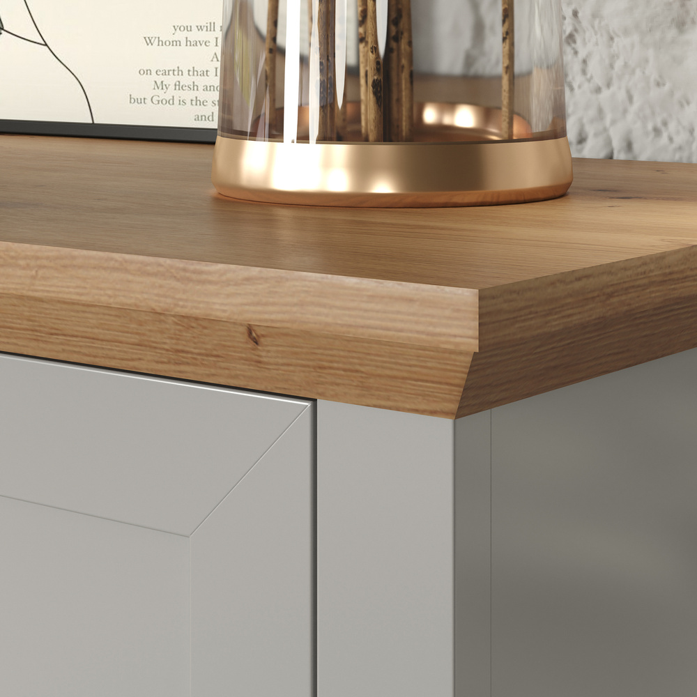 Korpus i fronty wykonane zostały z laminowanej płyty meblowej w kolorze jasnoszarym, odpornej na zarysowania i łatwej w utrzymaniu czystości. Górny blat w dekorze dąb artisan dodaje całości naturalnego charakteru i ciepła. Styl dopełniają czarne metalowe uchwyty, które podkreślają nowoczesną elegancję mebla.