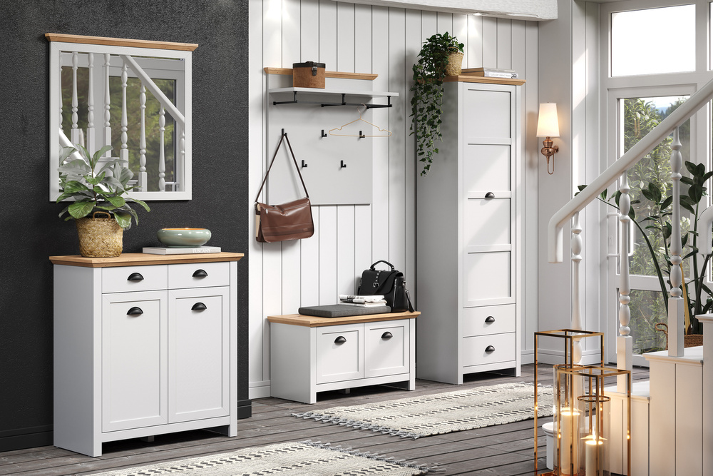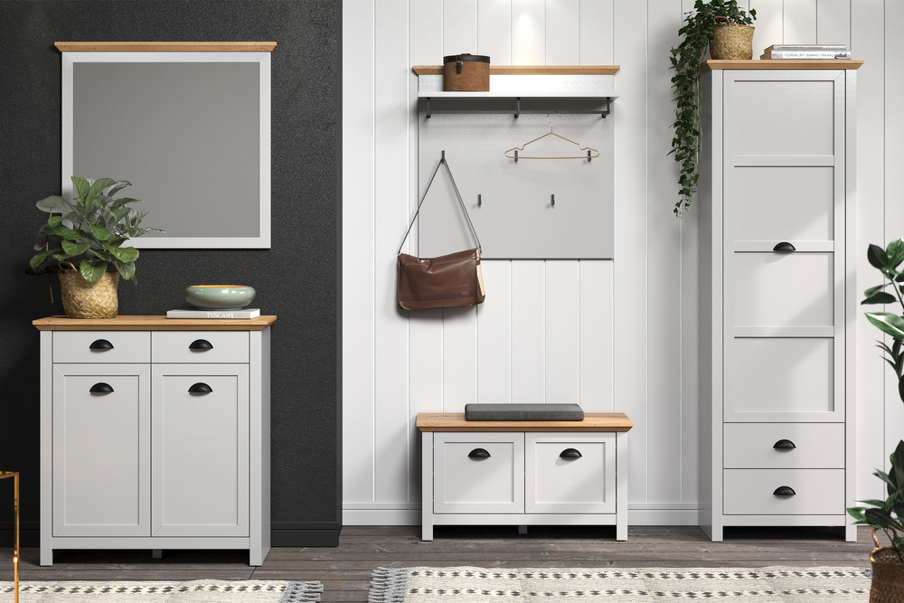 Postaw komodę Tosca przy wejściu i uzupełnij ją o lustro i wieszak z tej samej kolekcji, tworząc spójną i stylową strefę powitalną. Jasnoszary korpus pięknie kontrastuje z ciemnymi ścianami lub świetnie współgra z jasnymi wnętrzami utrzymanymi w stylu scandi, modern farmhouse lub japandi.