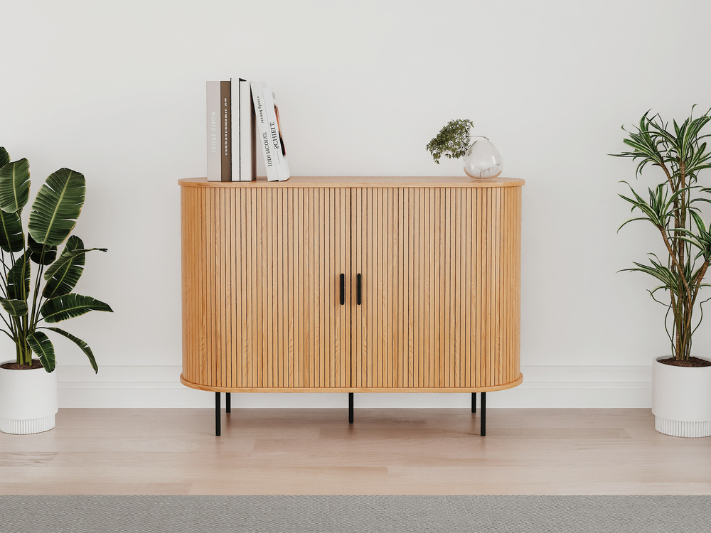 Komoda z drzwiami osadzona jest na czarnych metalowych nóżkach o średnicy około Ø 20 mm i wysokości około 17 cm. Dzięki temu zapewnia stabilność oraz ułatwia sprzątanie pod meblem. Zastosowano również drzwi przesuwne (rolety) z eleganckimi czarnymi metalowymi uchwytami.