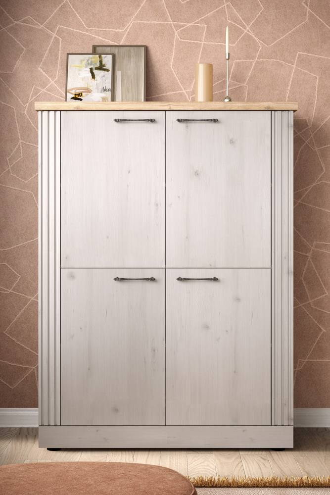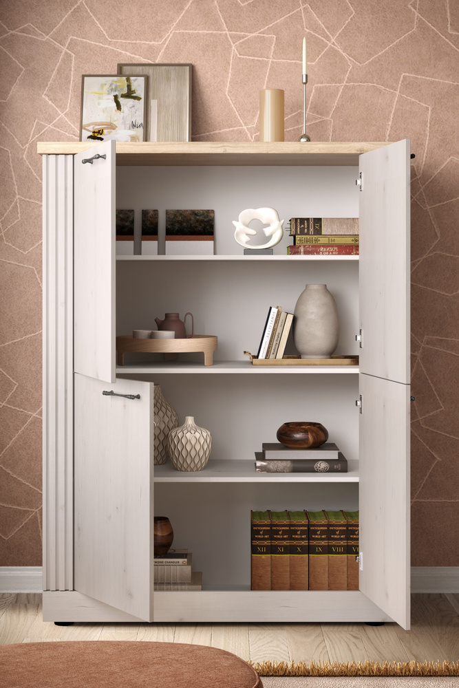 Cztery drzwi otwierają dostęp do aż czterech przestronnych półek, które pozwalają perfekcyjnie zorganizować wszystkie potrzebne rzeczy – od książek i dokumentów po porcelanę, dekoracje czy kolekcję win. Wysokość 160 cm sprawia, że mebel jest wyjątkowo pojemny, ale nie przytłacza wnętrza. To doskonałe rozwiązanie do mniejszych przestrzeni, w których liczy się każdy centymetr.
