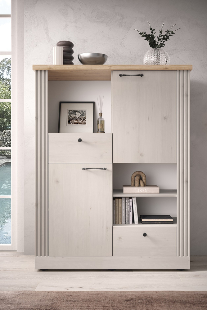 Avina to komoda, która wyróżnia się niebanalnym układem frontów i otwartych półek, łącząc praktyczne przechowywanie z dekoracyjnym charakterem. Jej jasne wybarwienie dąb Meringa z kontrastującym blatem w odcieniu dąb Cadiz wprowadza do wnętrza spokój, lekkość i nutę rustykalnej przytulności.