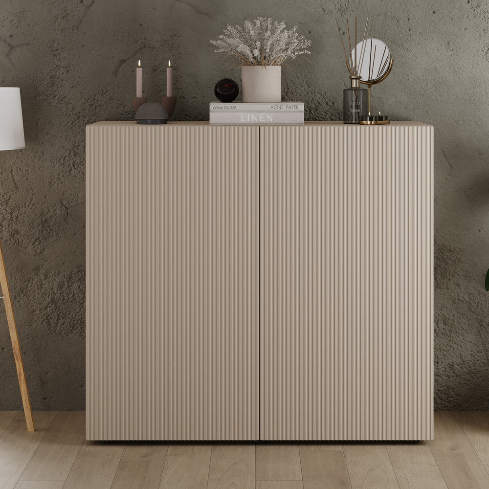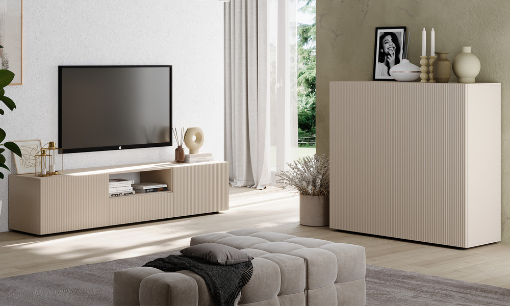 Wysoka komoda Corda to mebel, który łączy w sobie minimalistyczną formę i subtelną dekoracyjność. Jej ryflowane fronty w kolorze kaszmir mat wprowadzają do wnętrza elegancję i spójny rytm, a smukła sylwetka sprawia, że świetnie odnajdzie się w nowoczesnych aranżacjach.