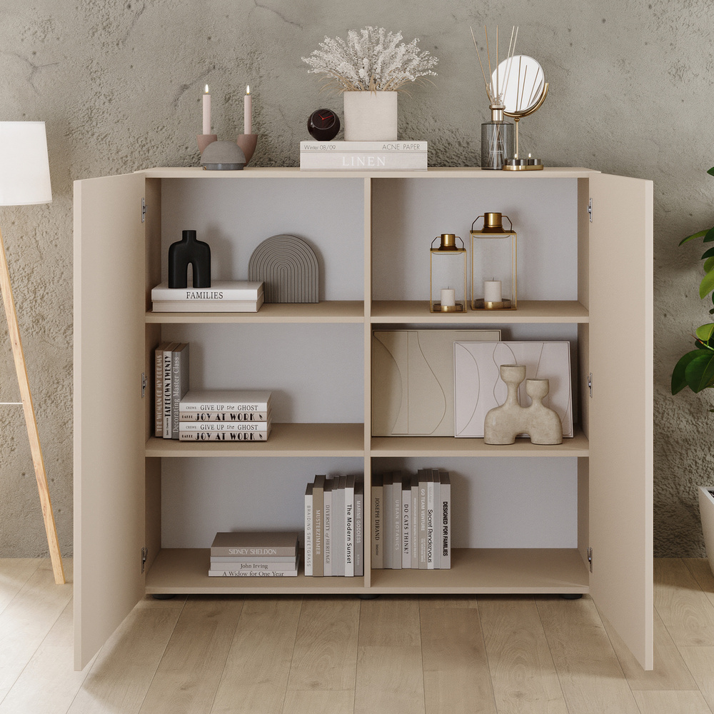 Przy wymiarach 121 × 42 × 111 cm komoda oferuje sporą przestrzeń do przechowywania w stosunkowo kompaktowej bryle. Doskonale sprawdzi się zarówno w salonie, jadalni, jak i w gabinecie, mieszcząc książki, akcesoria czy zastawę stołową. Jej wysokość sprawia, że blat znajduje dodatkowe zastosowanie jako przestrzeń ekspozycyjna dla dekoracji, roślin czy lamp.