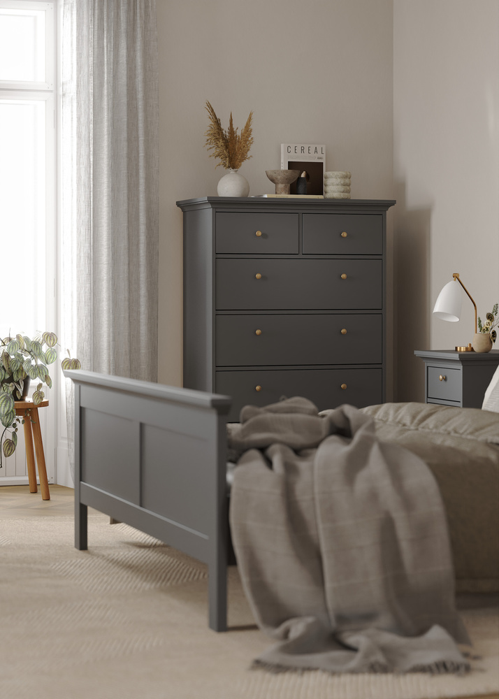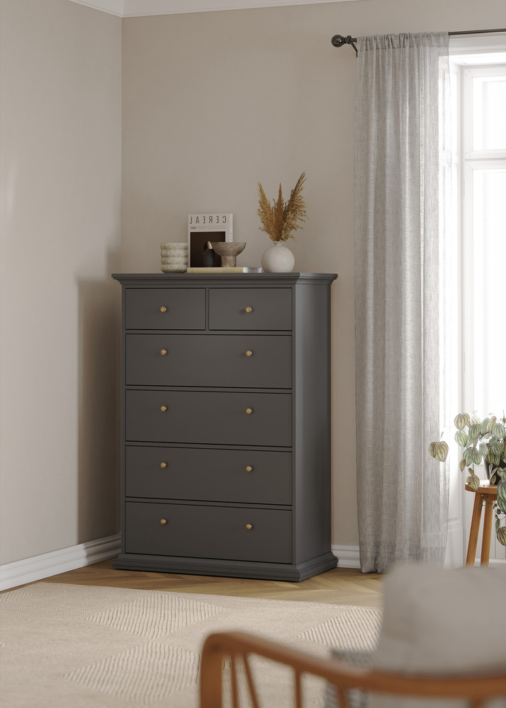 Komoda Paris w głębokim, matowym odcieniu szarości pięknie komponuje się z drewnianymi dodatkami i naturalnymi tekstyliami, tworząc przytulną atmosferę w pomieszczeniu. W sypialni postaw na niej ceramiczne dekoracje i miękkie lampy w ciepłych tonacjach, by stworzyć relaksującą przestrzeń. W salonie możesz wykorzystać ją jako stylowy bufet, dekorując eleganckimi wazonami, sztuką nowoczesną i minimalistycznymi świecami.