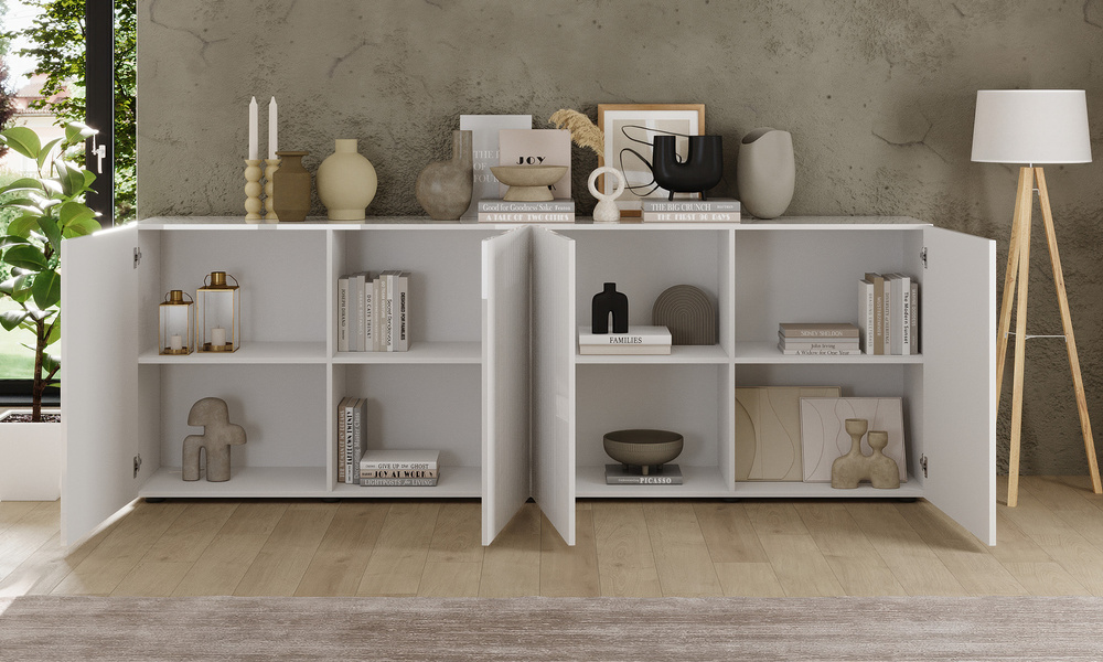 Komoda Corda w wykończeniu biały połysk to mebel, który łączy w sobie elegancję i nowoczesność. Jej szeroka bryła z ryflowanymi frontami przyciąga wzrok, a efekt odbijającej światło powierzchni dodaje wnętrzu przestronności i luksusowego charakteru.