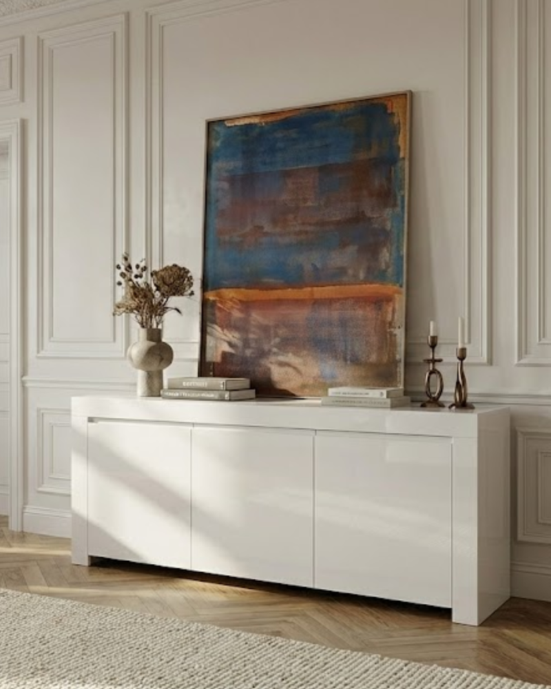 Aby stworzyć stylowe i eleganckie wnętrze, warto ustawić komodę Amaretto na tle jasnej ściany, najlepiej z elementami sztukaterii. Taki wybór doskonale współgra z dekoracjami w stylu soft modern. Możesz dodać duży obraz oparty o ścianę oraz ceramikę w odcieniach piasku i kamienia, co nada przestrzeni subtelności i ciepła. Kilka książek ułożonych warstwowo dopełni całości.