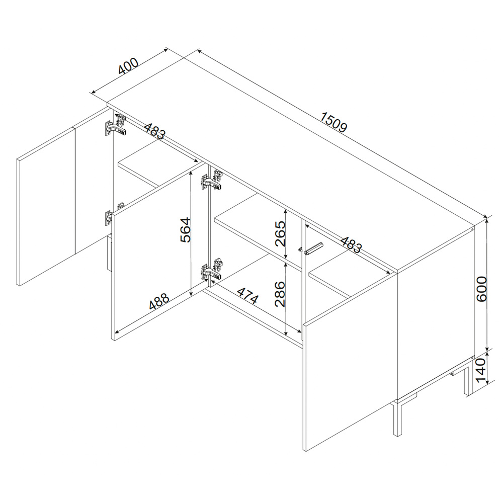 Bryła komody została wykonana z trwałej płyty wiórowej 16 mm, a fronty wykończono dekoracyjną frezowaną wstawką z foliowanej płyty MDF, co podkreśla nowoczesny charakter kolekcji. Trzy fronty otwierane do boków obsługiwane są bezuchwytowym systemem push to open, który gwarantuje wygodę i czystą linię frontu. Stabilność zapewniają metalowe nóżki o wysokości 14 cm, a za zamkniętymi drzwiami znajdują się trzy pojemne komory, każda z praktyczną półką.