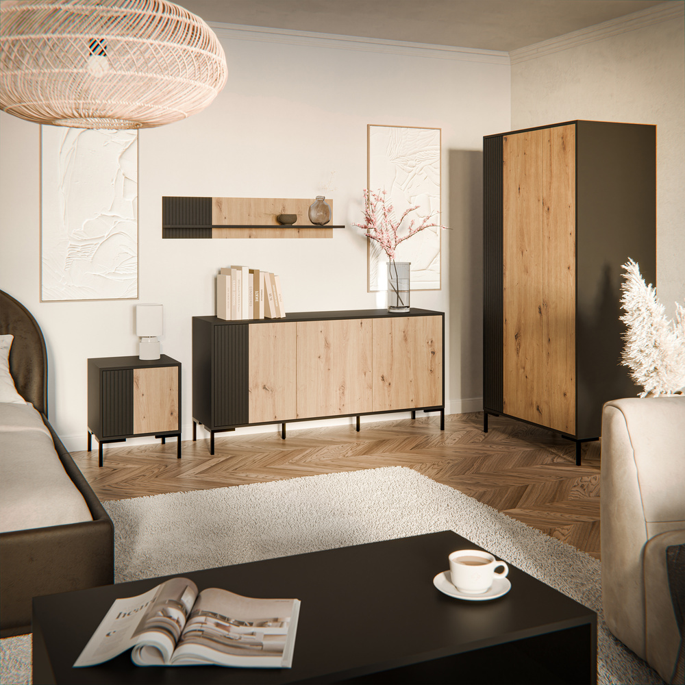 Komoda Arden to połączenie nowoczesnego minimalizmu i naturalnego piękna drewna. Jej elegancki design, oparty na kontrastach czerni w macie i dekoru dąb artisan, sprawia, że mebel doskonale komponuje się zarówno z nowoczesnymi, jak i loftowymi wnętrzami.