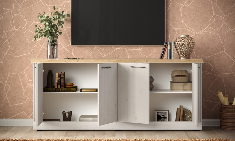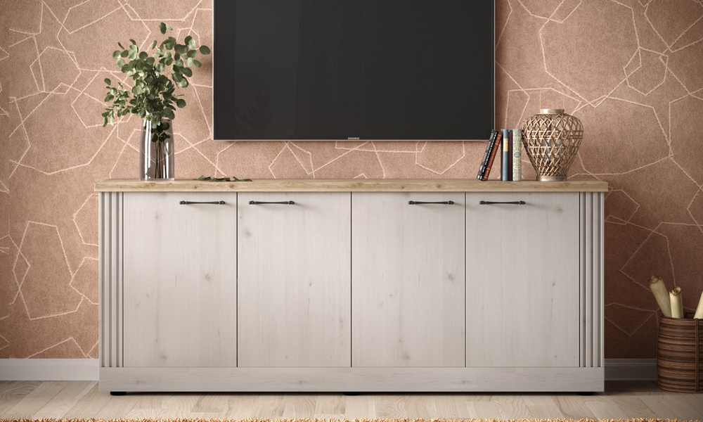 Czterodrzwiowa konstrukcja kryje pojemne wnętrze z półkami, które pozwalają zorganizować wszystko – od zastawy stołowej, przez tekstylia, po dokumenty i dekoracje. Dzięki szerokości 211 cm mebel oferuje dużą ilość miejsca, nie przytłaczając przy tym przestrzeni. Wysokość 88 cm sprawia, że blat komody zyskuje dodatkową funkcję – jako przestrzeń do ekspozycji ulubionych dodatków.