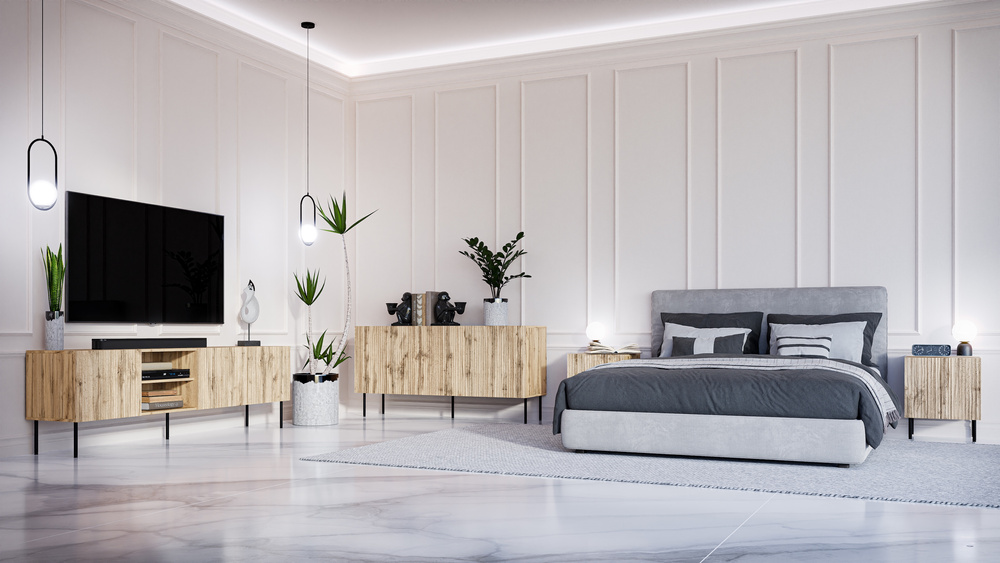 Frezowane fronty Fiori same w sobie stanowią ozdobę komody, dlatego cała aranżacja nabierze elegancji dzięki zachowaniu prostoty i minimalizmu.
