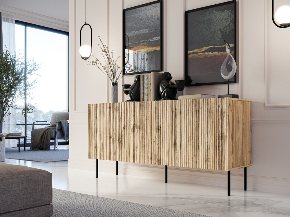 Komoda Fiori o długości 152 cm w kolorze dąb wotan to harmonijne połączenie designu i funkcjonalności. Jej charakterystyczną cechą są frezowane fronty, które nadają meblowi unikalny wygląd i wyróżniają go nawet bez dodatkowych ozdób. Smukłe, czarne metalowe nóżki o wysokości 20 cm dodają komodzie lekkości oraz podkreślają jej nowoczesny styl.