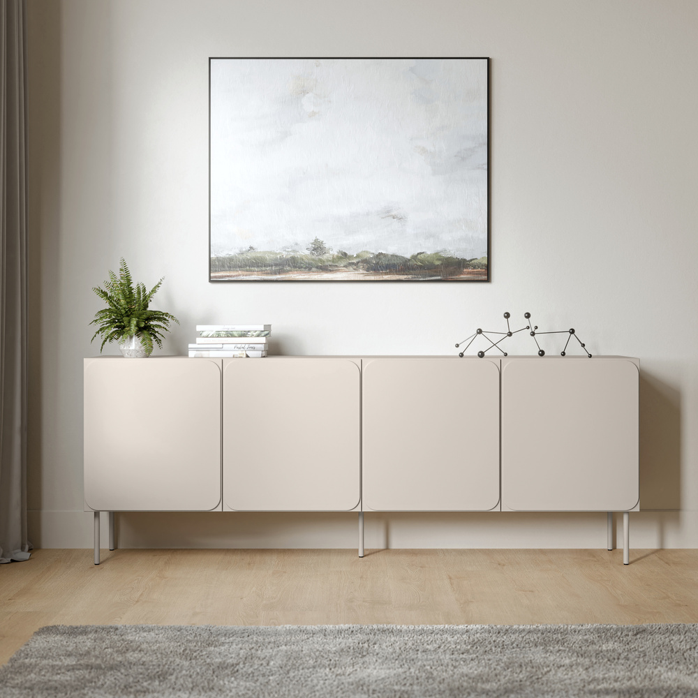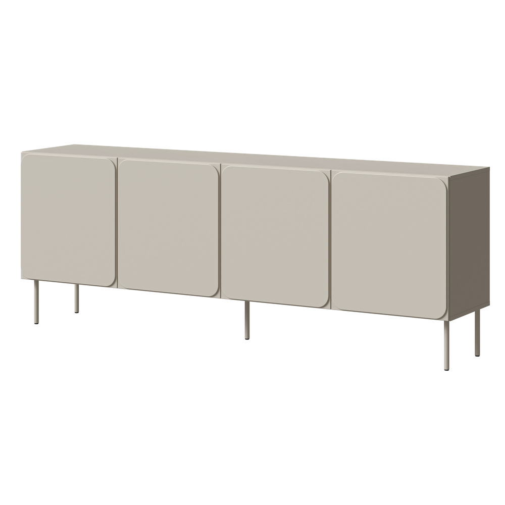 Komoda Verno w wybarwieniu kaszmir mat to esencja subtelnej elegancji i prostoty. Cztery drzwi, matowe wykończenie i smukłe metalowe nóżki tworzą harmonijny mebel, który doskonale wkomponuje się w jasne, nowoczesne wnętrza.