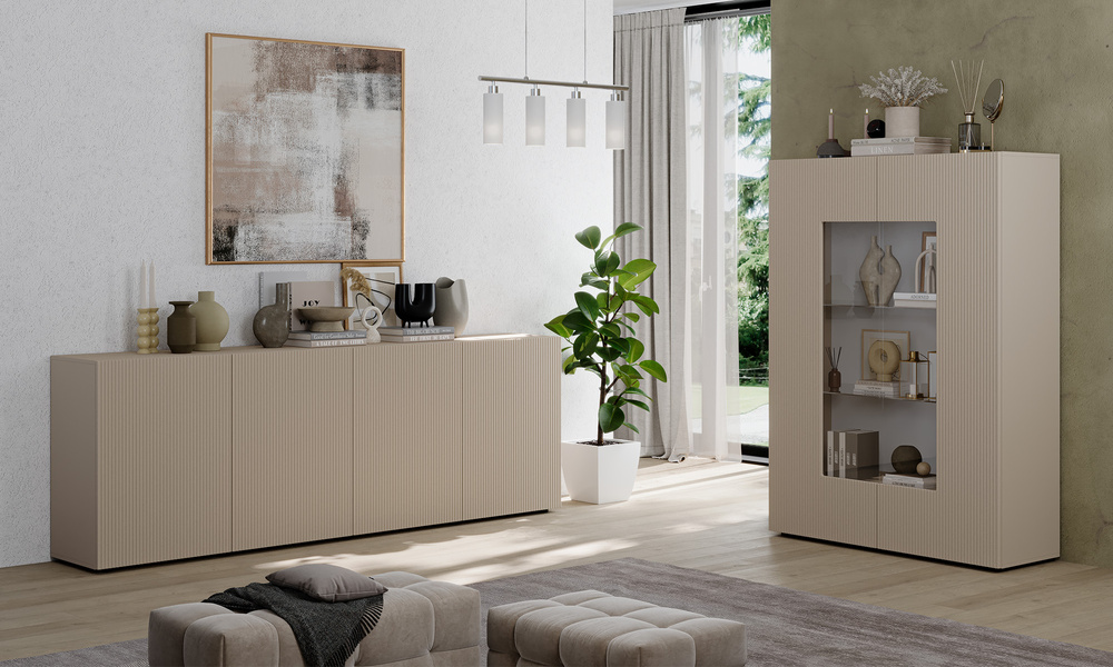 Komoda Corda zachwyca elegancją prostych linii i wyrafinowaną kolorystyką. Szeroka bryła z ryflowanymi frontami w odcieniu kaszmir mat stanowi idealne połączenie nowoczesności i subtelnej dekoracyjności.