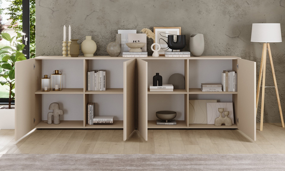 Komoda Corda doskonale odnajdzie się w przestronnych salonach i nowoczesnych jadalniach. Jej szeroki blat można wykorzystać do ekspozycji dekoracji – obrazów, ceramiki czy lamp. W zestawieniu z witrynami z tej samej kolekcji stworzy elegancki komplet, który wprowadzi do wnętrza spokój i harmonię, a w połączeniu z naturalnymi dodatkami podkreśli styl quiet luxury.