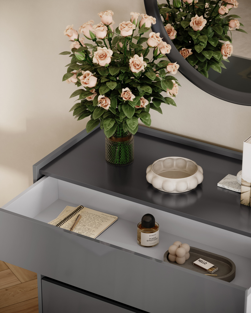 Komoda Teo w antracytowym macie to propozycja idealna do wnętrz urządzonych w stylu nowoczesnym, loftowym lub skandynawskim z nutą minimalizmu. Może pełnić funkcję szafki pod lustro w sypialni, stylowego schowka w salonie lub praktycznego elementu w przedpokoju. W towarzystwie czarnej lampy stołowej, metalowych dekoracji i matowego lustra stworzy uporządkowaną i stylową przestrzeń.