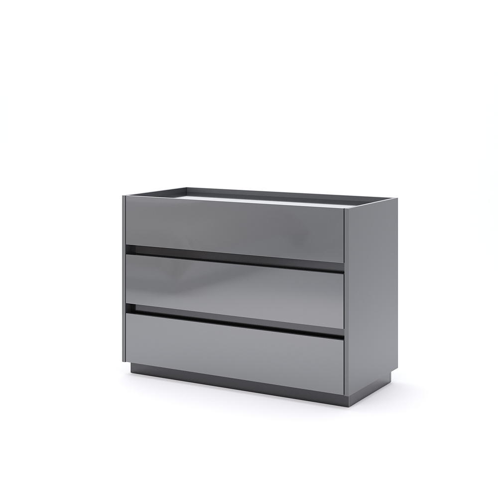 Nowoczesna komoda Teo to minimalistyczna forma skrywająca maksymalną funkcjonalność. Trzy pojemne szuflady zamknięte w estetycznej bryle w kolorze antracyt mat tworzą idealną odpowiedź na potrzeby współczesnych wnętrz – oszczędną w wyrazie, a jednocześnie niezwykle praktyczną.