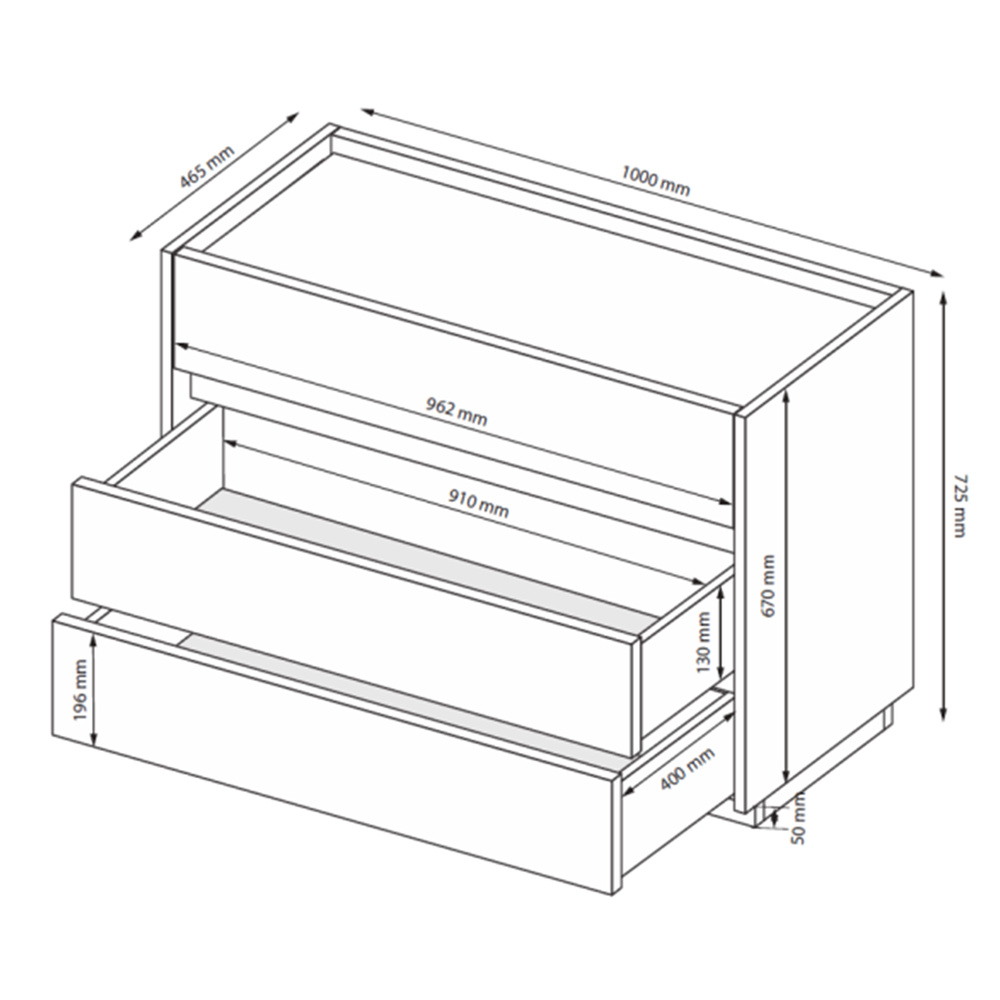 Dzięki trzem przestronnym szufladom komoda Teo doskonale sprawdzi się jako miejsce na odzież, dokumenty, akcesoria czy domowe drobiazgi. Każda z szuflad otwiera się płynnie i cicho, co jest zasługą solidnych prowadnic – komfort użytkowania to tu priorytet.