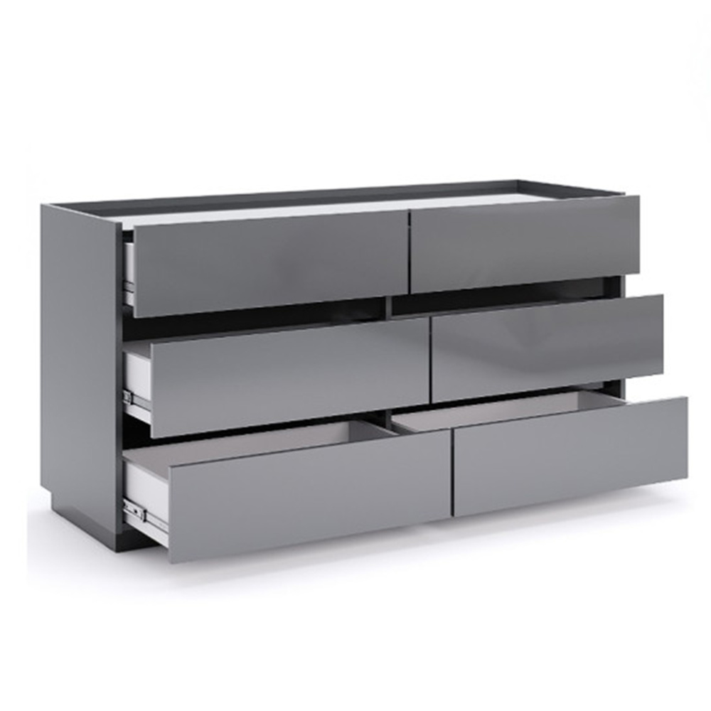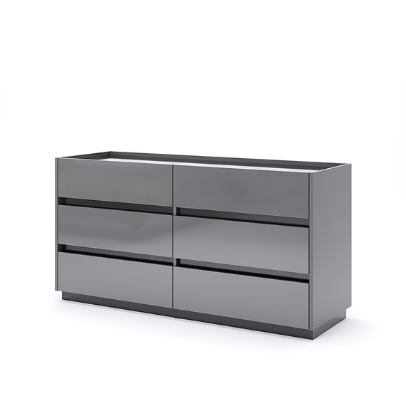 Teo w wersji sześcioszufladowej to doskonały wybór do sypialni, salonu, a nawet domowego biura. Antracytowy mat dobrze komponuje się z elementami drewna, czarnym metalem i szarościami. Umieść komodę pod oknem z zasłonami z lnu, obok lustra w cienkiej ramie lub w towarzystwie grafiki na ścianie – i stwórz przestrzeń, która zachwyca porządkiem i stylem.