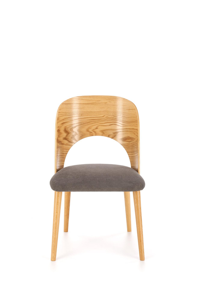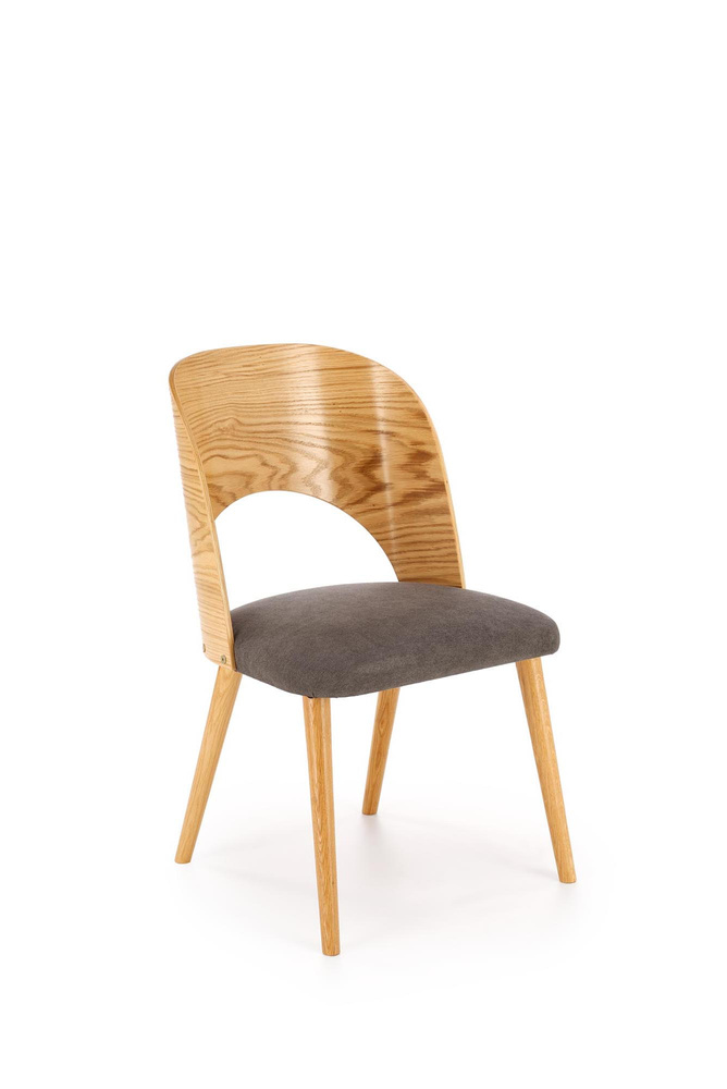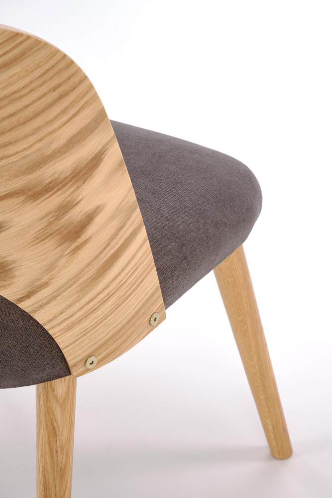Krzesło do jadalni Cadiz zostało wykonane z litego drewna dębowego oraz sklejki giętej w dębowym fornirze, co nadaje mu wyjątkową trwałość i naturalny urok. Wygięte oparcie idealnie dopasowuje się do sylwetki, zapewniając wygodne wsparcie pleców. Siedzisko tapicerowane miękką tkaniną w odcieniu popielatym dodaje krzesłu nowoczesnego akcentu i podnosi komfort użytkowania. Smukłe nogi, zwężane ku dołowi, dopełniają całości, tworząc lekką i harmonijną sylwetkę.