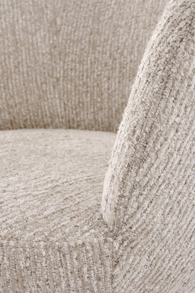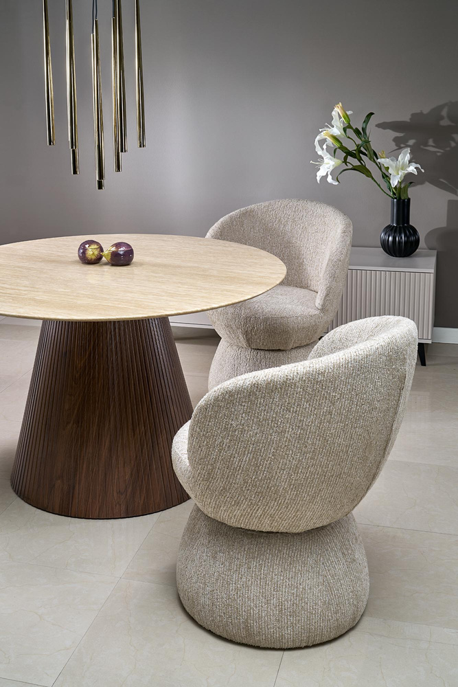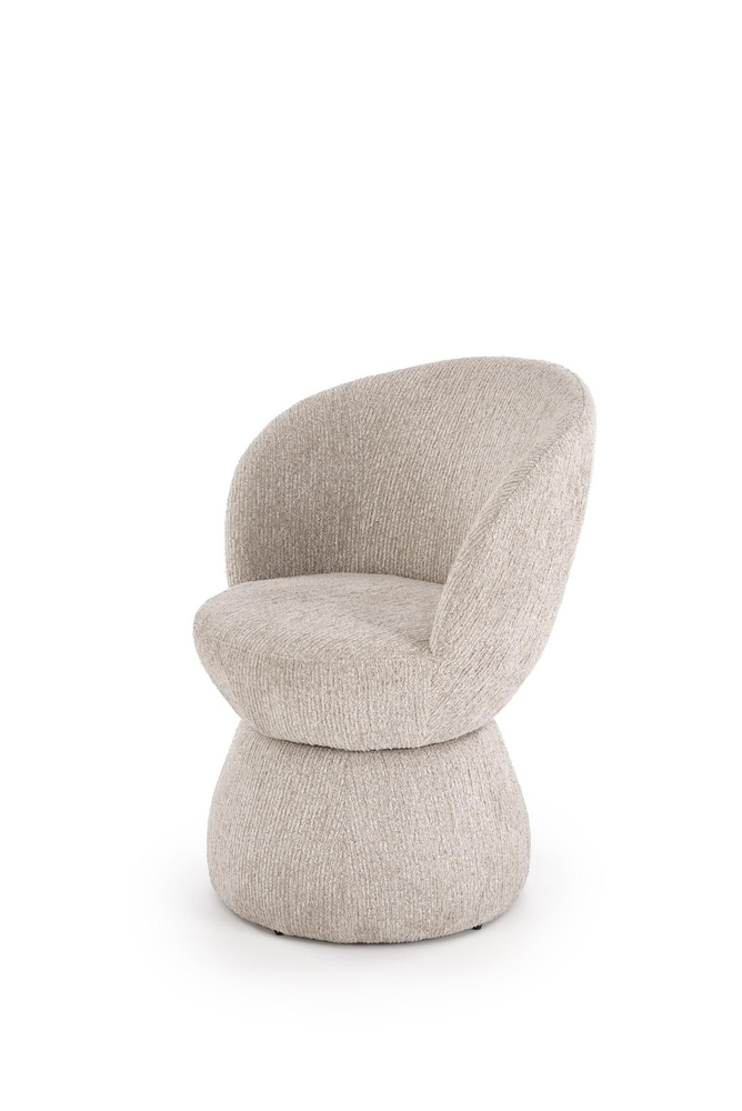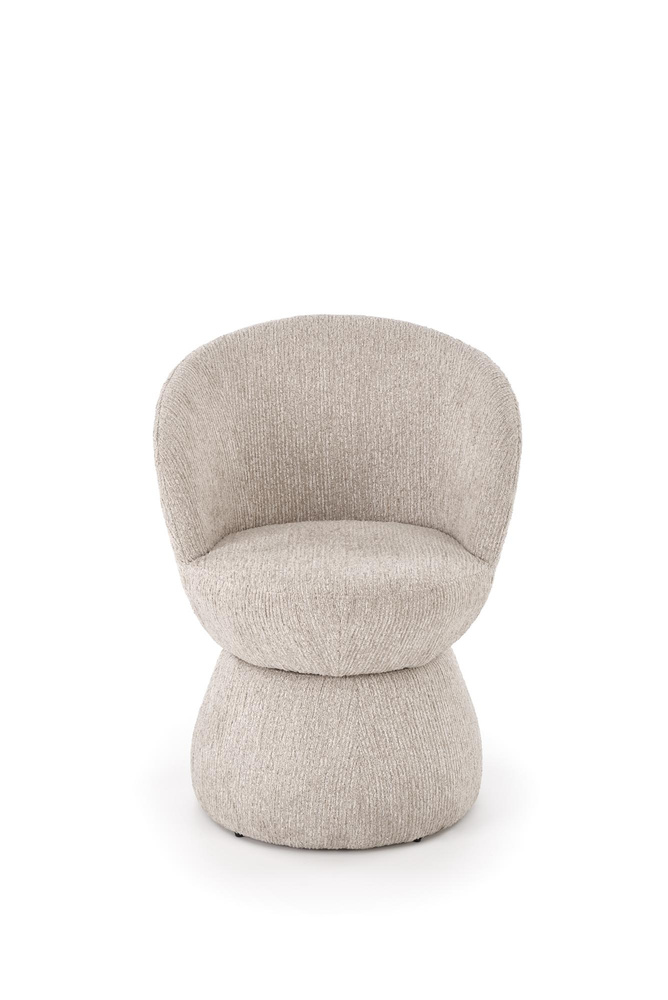 Krzesło K-581 zostało w całości tapicerowane miękką, przyjemną w dotyku tkaniną w odcieniu beżu. Obłe kształty siedziska i oparcia tworzą zwartą, nowoczesną formę, która zapewnia stabilność i estetyczny wygląd. Solidna podstawa ukryta w dolnej części nadaje całości lekkości wizualnej, a jednocześnie gwarantuje trwałość.