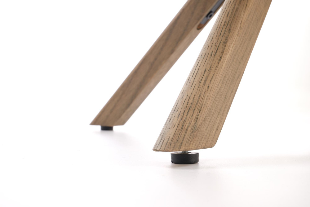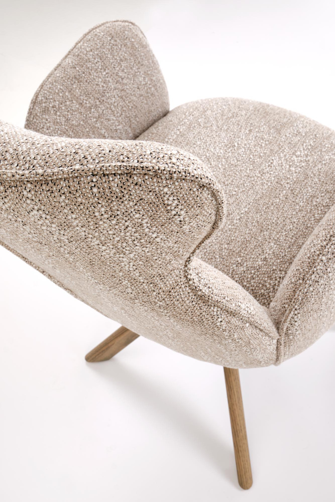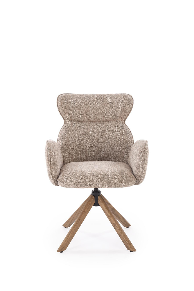 Krzesło do jadalni wykonany został z wysokiej jakości tkaniny w odcieniu ciemnego beżu, odpornej na codzienne użytkowanie. Stabilną podstawę tworzy lite drewno dębowe w kolorze jasnego orzecha, które nie tylko dodaje meblowi lekkości wizualnej, ale również zapewnia trwałość na lata. Funkcja obracania zwiększa komfort, umożliwiając swobodne poruszanie się bez konieczności przesuwania krzesła.