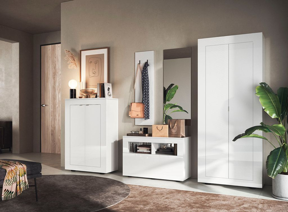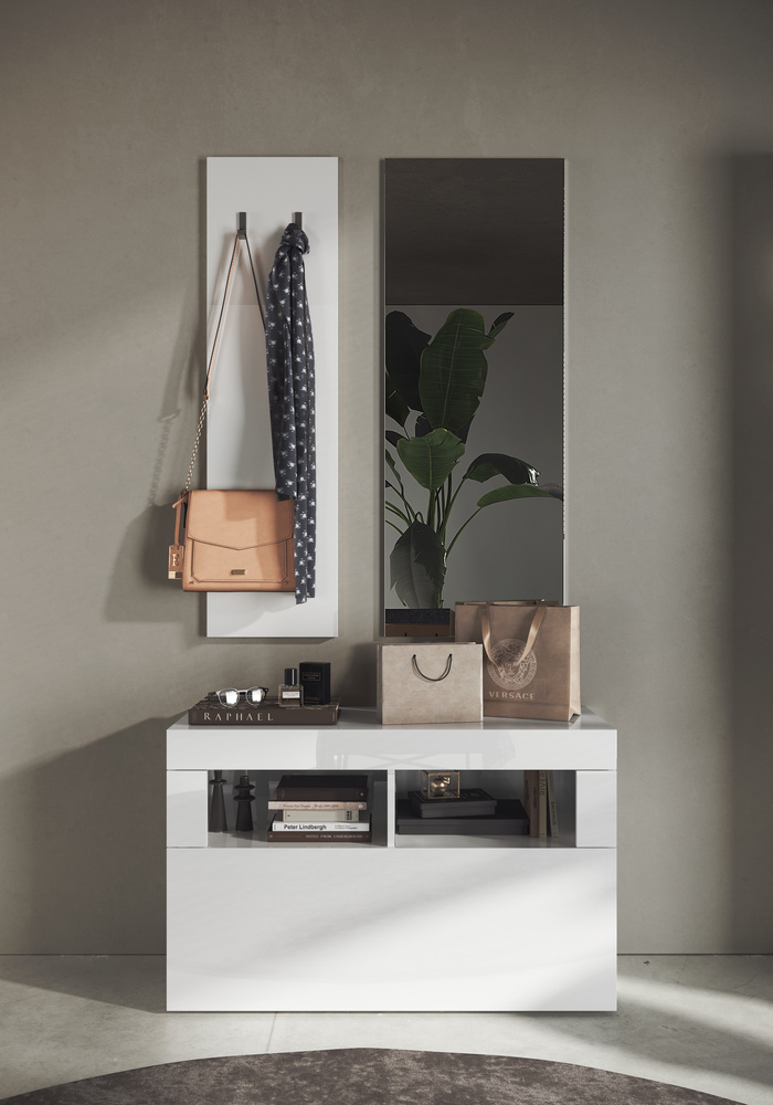 Lustro Basic najlepiej prezentuje się w zestawieniu z białymi, połyskującymi meblami z tej samej serii, tworząc harmonijną i elegancką kompozycję. W nowoczesnym przedpokoju świetnie współgra z panelami ściennymi i oświetleniem LED, a w skandynawskim wnętrzu może stanowić subtelne tło dla naturalnych dodatków – drewna, tkanin i zielonych roślin.