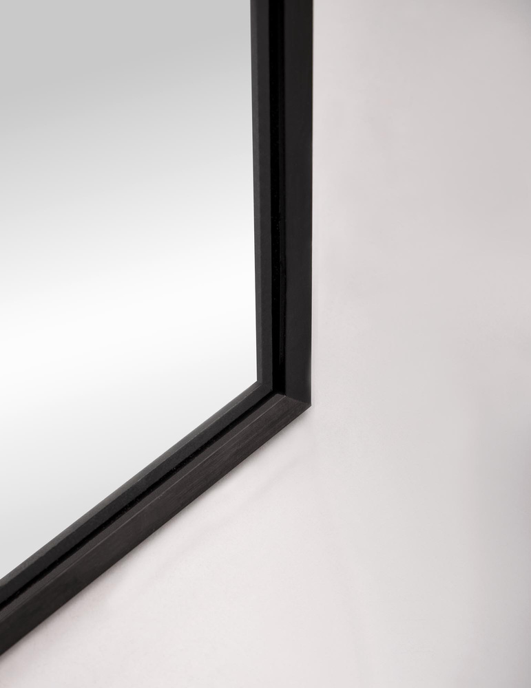 Lustro zostało osadzone w smukłej ramie z aluminium, która została pomalowana na głęboki, matowy odcień czerni. Podkład wykonany z solidnej płyty MDF gwarantuje trwałość i stabilność konstrukcji, a gładka tafla lustra zapewnia doskonałe odwzorowanie obrazu bez zniekształceń. Całość mierzy 60 cm szerokości, 120 cm wysokości i zaledwie 3,7 cm głębokości, co sprawia, że lustro prezentuje się lekko, nawet w mniejszych przestrzeniach.