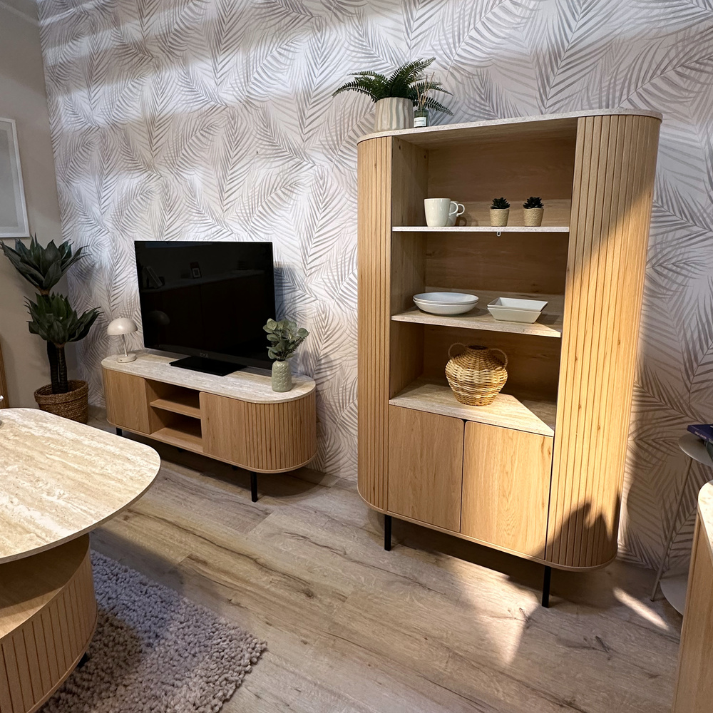 Regał Fabia 100 cm to doskonały wybór dla osób ceniących nowoczesne i wizualnie lekkie meble inspirowane stylem organicznym. Jego zaokrąglone linie oraz subtelne ryflowania w połączeniu z kolorem dębu i półkami w dekorze trawertynu nadają wnętrzu elegancji, harmonii oraz naturalnego charakteru. Regał idealnie sprawdzi się zarówno w salonie, jak i jadalni czy domowym biurze, stając się funkcjonalnym i stylowym elementem wyposażenia każdego pomieszczenia.
