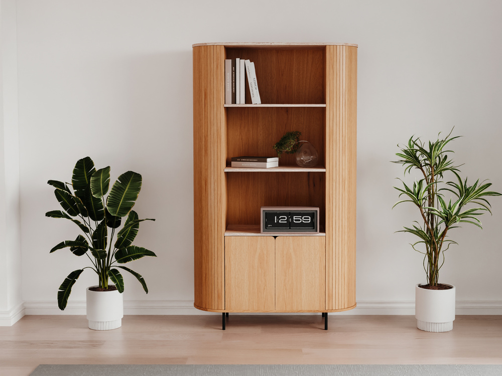 Regał Fabia doskonale wpisuje się w jasne, nowoczesne wnętrza, zwłaszcza te utrzymane w stylu modern organic, soft minimal lub scandi calm. W salonie może pełnić funkcję eleganckiej biblioteczki, natomiast w jadalni świetnie sprawdzi się jako miejsce na ceramikę i szkło. W domowym gabinecie z kolei idealnie nadaje się do przechowywania dokumentów i dekoracji.
