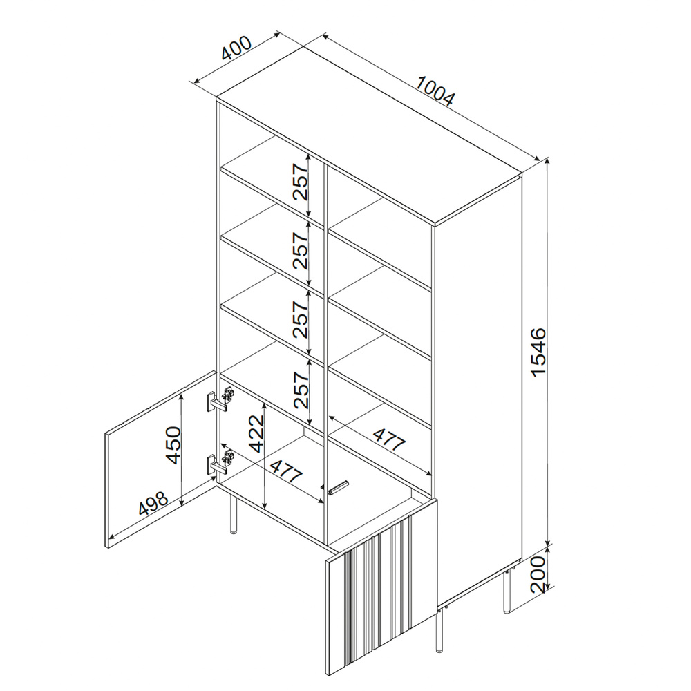 Korpus regału został wykonany z trwałej płyty laminowanej o grubości 16 mm, co zapewnia solidność i odporność na codzienne użytkowanie. Fronty z płyty MDF o tej samej grubości ozdobiono nowoczesnymi, pionowymi frezami, które dodają meblowi głębi i elegancji. Całość spoczywa na metalowych nóżkach o wysokości 20 cm, malowanych w kolorze mebla, co nadaje konstrukcji lekkości i ułatwia sprzątanie pod spodem. Brak uchwytów i zastosowanie systemu push to open to ukłon w stronę nowoczesnego, czystego wzornictwa bez kompromisów w wygodzie.