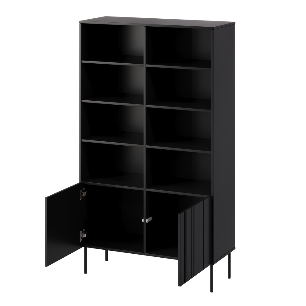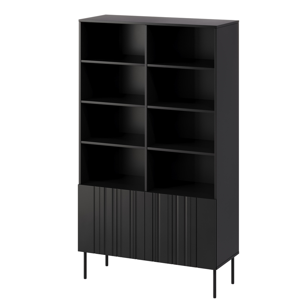 Regał Milo w kolorze czarnego matu to stylowy mebel, który doskonale łączy nowoczesny minimalizm z funkcjonalnością. Jego prosta forma, wykończona dekoracyjnymi frezami na frontach, przyciąga wzrok i wprowadza do wnętrza elegancki, wyrazisty akcent. To idealna propozycja dla tych, którzy szukają mebla z charakterem — zarówno do salonu, jak i domowego biura czy jadalni.