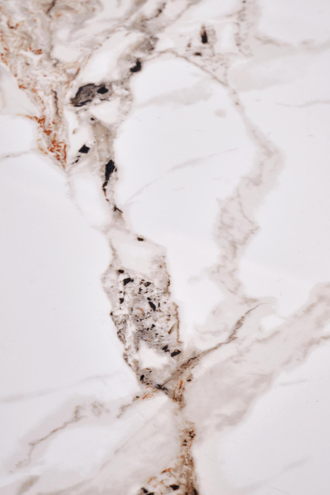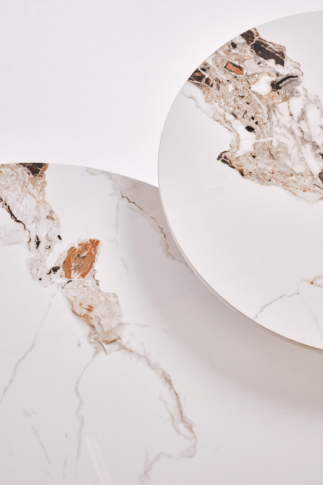 Model wykonano z trwałego spieku imitującego marmur, który nadaje blatowi subtelny połysk i wyjątkową odporność na codzienne użytkowanie. Podstawa z MDF-u okleinowanego w kolorze orzecha została zaprojektowana w formie otwartej, pionowej konstrukcji o rytmicznym układzie listew. Dzięki temu stolik zyskuje przestrzenną lekkość, zachowując przy tym doskonałą stabilność.