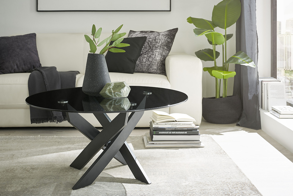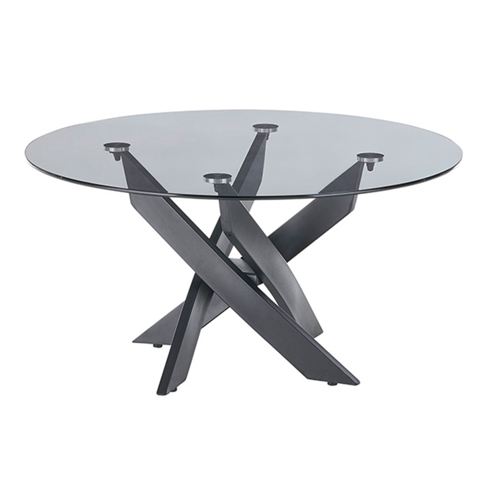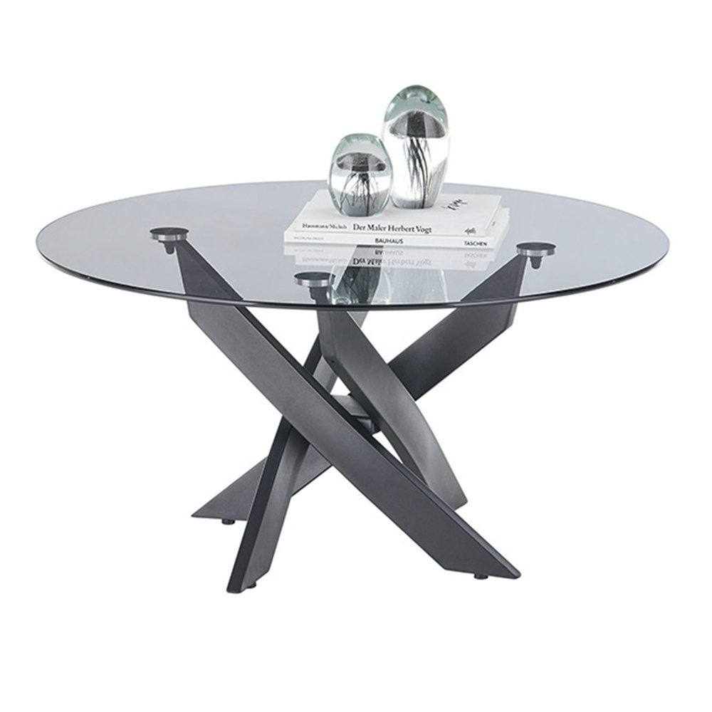 Blat wykonany z szarego, hartowanego szkła spoczywa na metalowych nogach o matowym, czarnym wykończeniu, które krzyżują się w dynamiczny, niemal rzeźbiarski sposób. To połączenie lekkości szkła z mocą metalu nadaje meblowi wyrafinowanej, ale zdecydowanej formy.