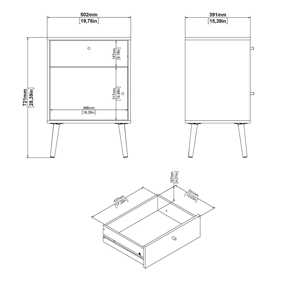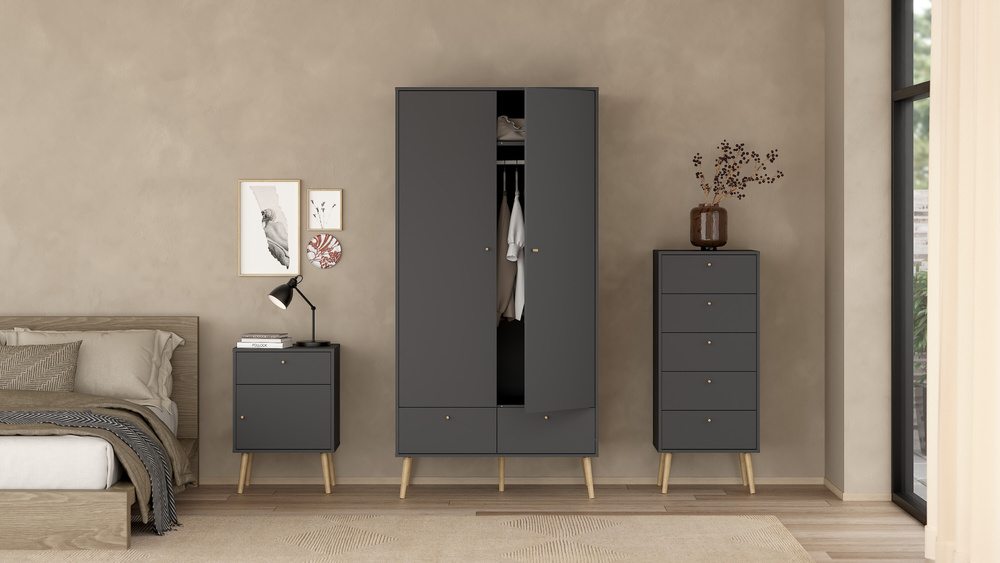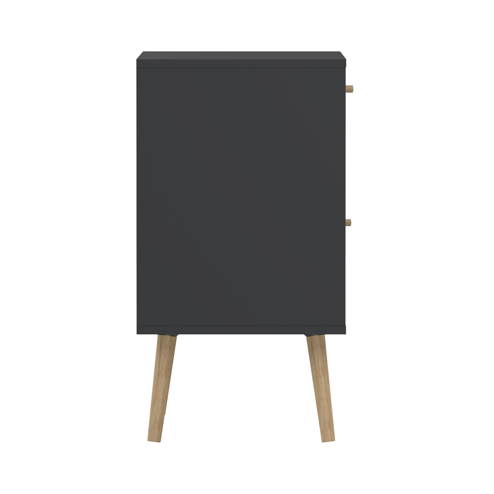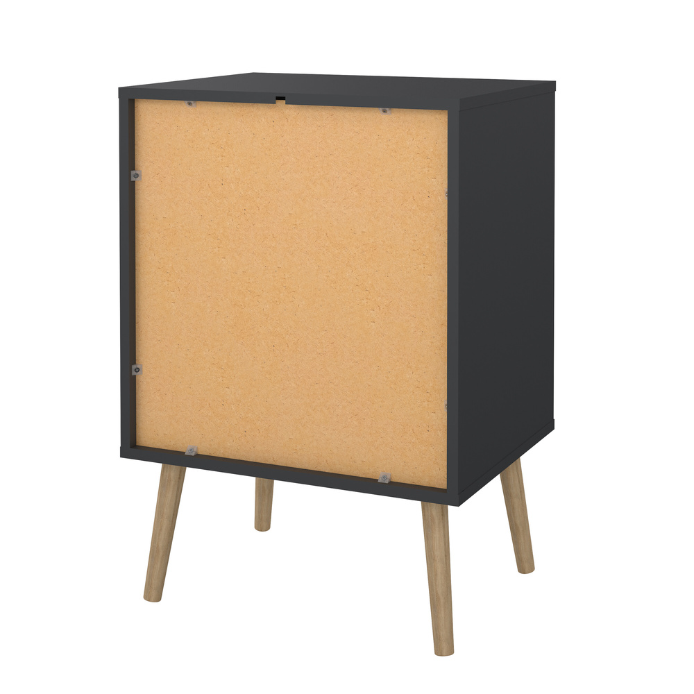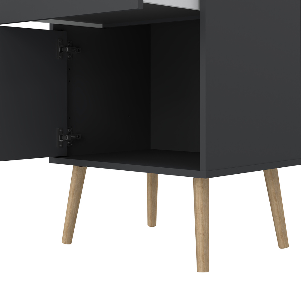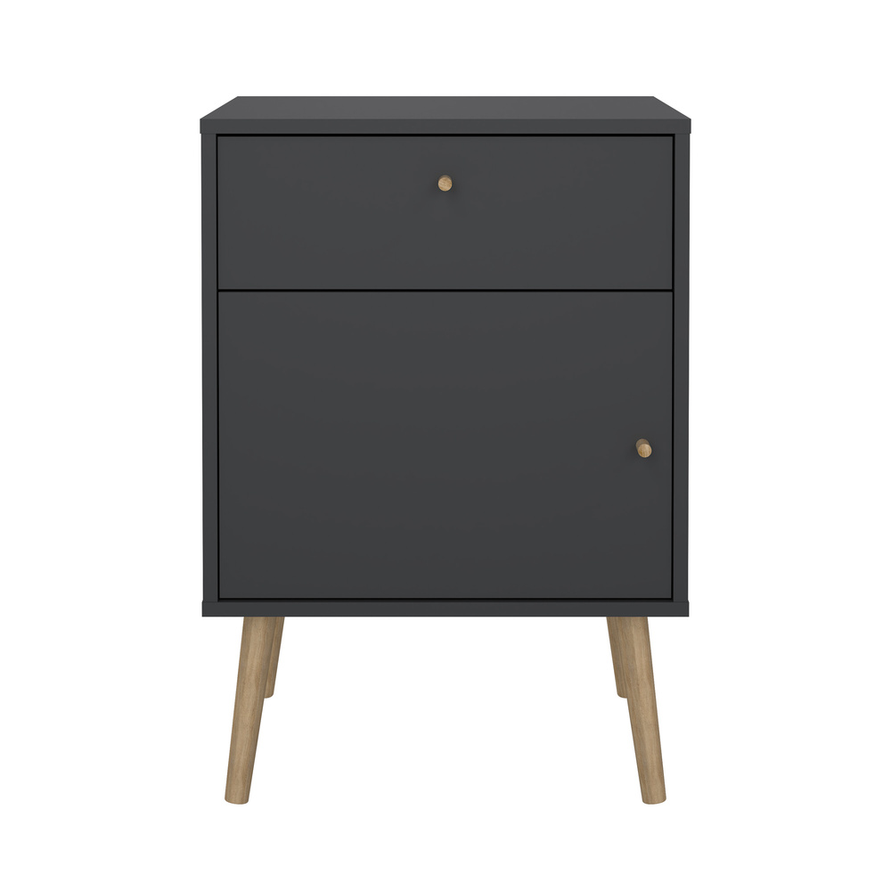 Wykonana z wysokiej jakości płyty meblowej, Bodo opiera się na 20-centymetrowych, smukłych nogach z drewna, które nadają konstrukcji wizualną lekkość i nowoczesny wydźwięk. Matowe wykończenie w odcieniu głębokiej szarości świetnie kontrastuje z drewnianymi uchwytami, dodając meblowi ciepła i charakteru. Na górze – praktyczna szuflada, poniżej – zamknięta komora z drzwiami, idealna do przechowywania większych przedmiotów.