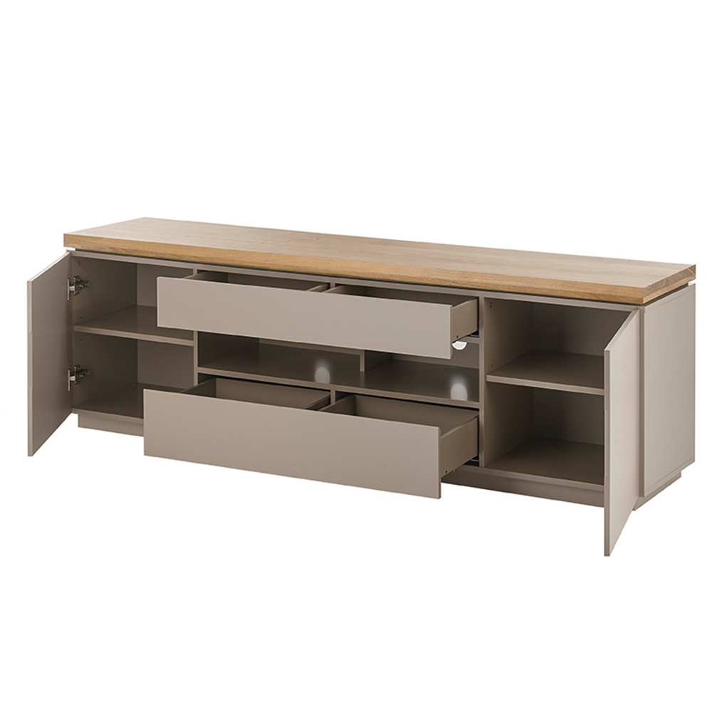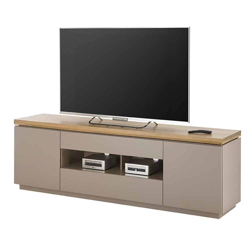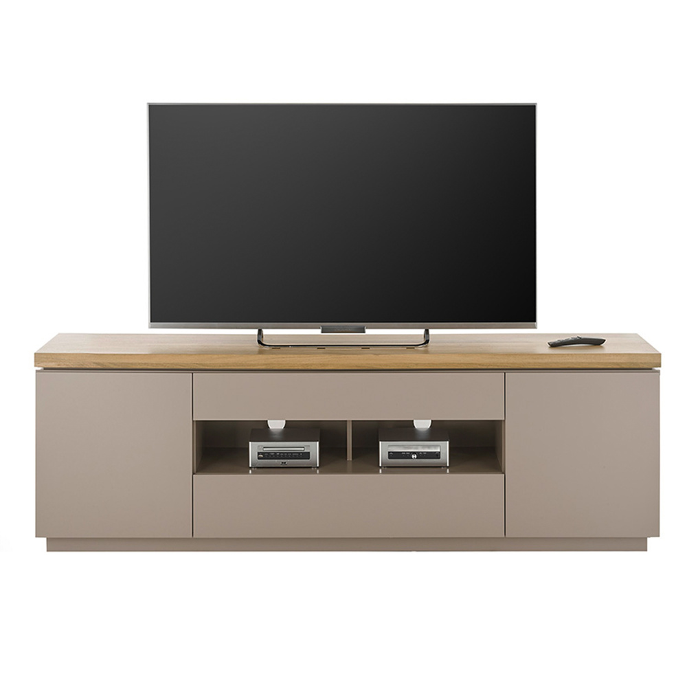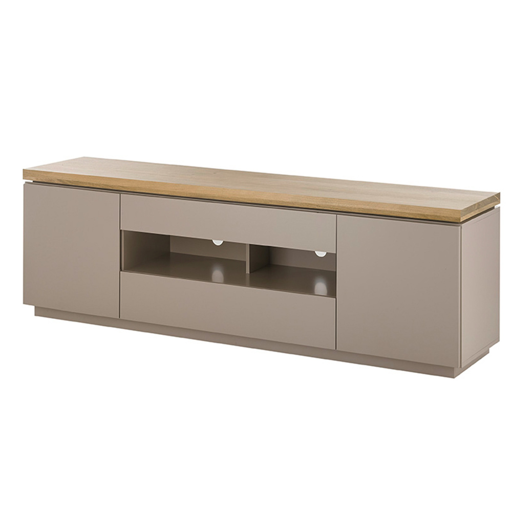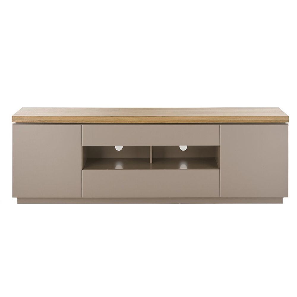 Szafka RTV Cavo, 173 x 40 x 57 cm, beżowoszara mat, blat drewno akacjowe