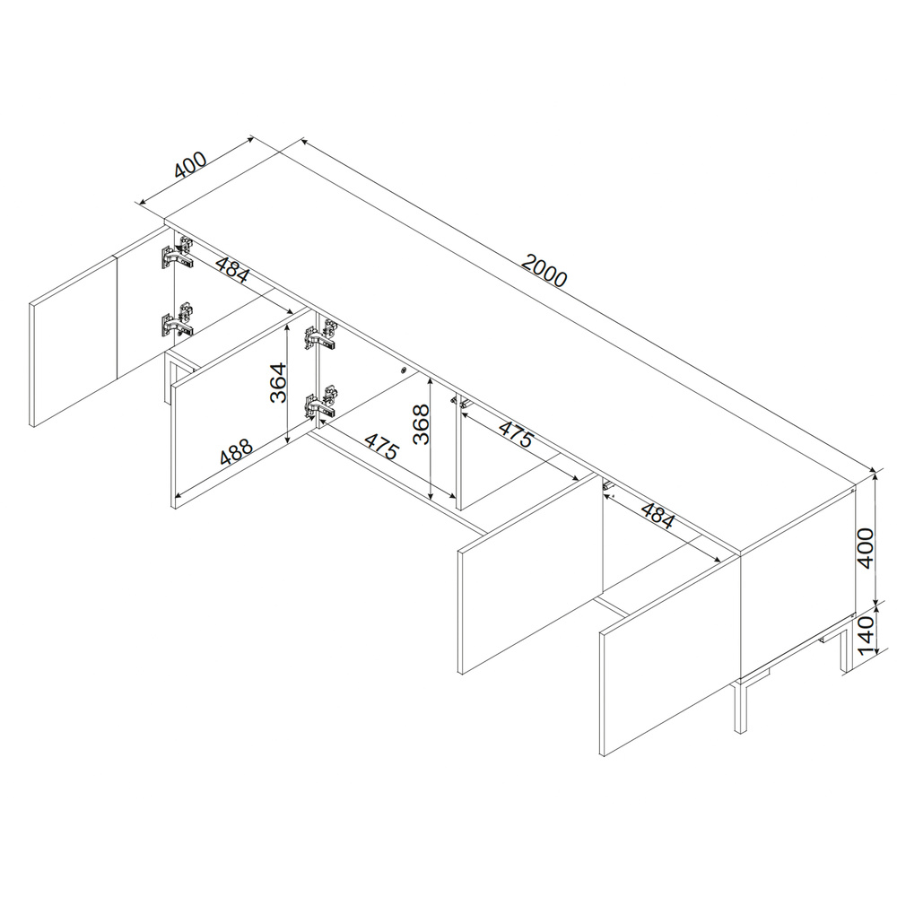 Mebel został wykonany z trwałej płyty wiórowej 16 mm, a fronty zdobi dekoracyjna frezowana wstawka z foliowanej płyty MDF, nadająca całości wyrazistości. Cztery fronty otwierane do boków wyposażono w wygodny system push to open, który eliminuje konieczność stosowania uchwytów i podkreśla minimalistyczny charakter bryły. Stabilne metalowe nóżki o wysokości 14 cm dodają lekkości oraz ułatwiają utrzymanie czystości pod meblem. Wewnątrz znajdują się cztery komory z praktycznymi półkami, które zapewniają optymalną organizację przestrzeni.