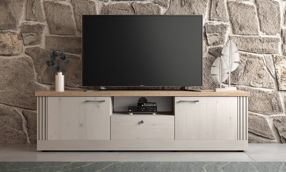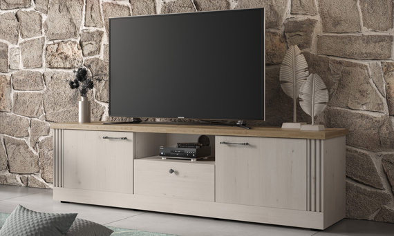 Avina to nie tylko ozdoba salonu, ale przede wszystkim praktyczny mebel, który ułatwia codzienne funkcjonowanie. Szafka została wyposażona w dwie pojemne szafki zamykane – idealne na dokumenty, płyty lub akcesoria do kina domowego. W środkowej części znajduje się przestronna półka na dekoder lub konsolę oraz głęboka szuflada na drobne przedmioty. Dzięki dobrze przemyślanej konstrukcji, wszystko ma tu swoje miejsce, a porządek w salonie utrzymuje się niemal sam.