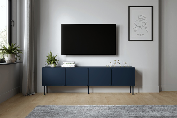 Szafka RTV Verno w odcieniu indigo to idealna propozycja dla miłośników minimalistycznego designu i eleganckich detali. Cztery fronty bez uchwytów, gładka bryła i smukłe metalowe nóżki sprawiają, że mebel jest lekki wizualnie, a jednocześnie bardzo pojemny.