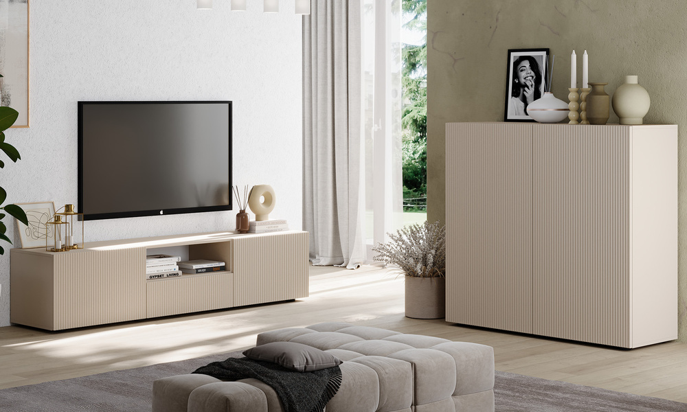 Szafka RTV Corda to elegancka i funkcjonalna baza dla nowoczesnej strefy rozrywki. Jej minimalistyczna forma, ryflowane fronty w odcieniu kaszmir mat oraz praktyczny układ schowków sprawiają, że mebel harmonijnie łączy design z codzienną wygodą.