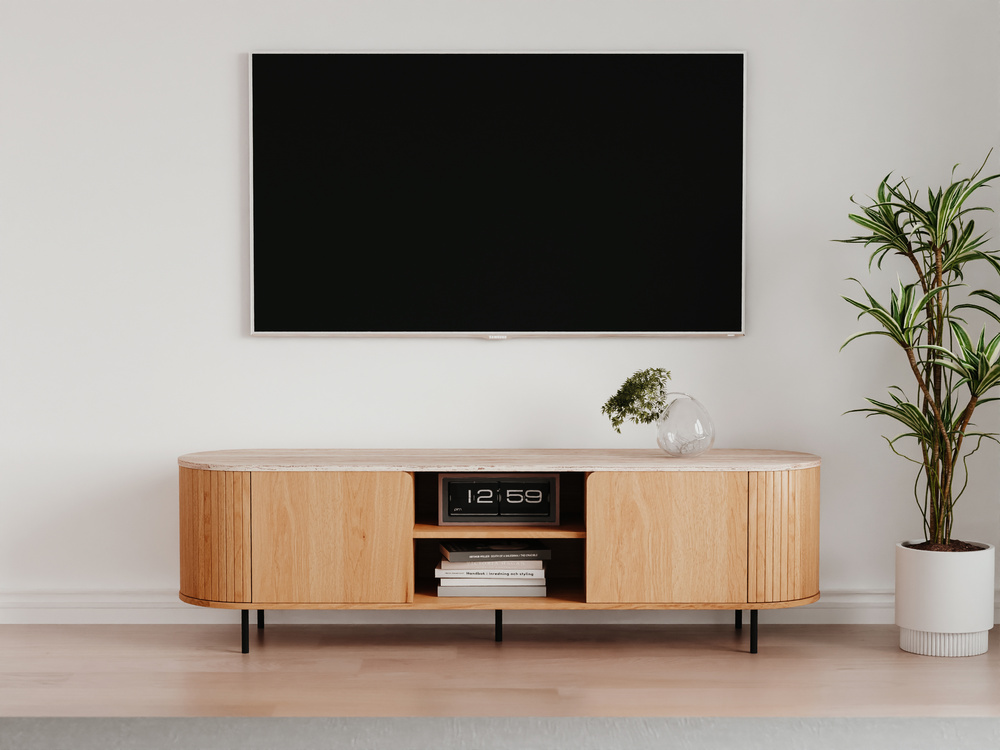 Szafka RTV Fabia 160 cm to nowoczesny mebel, który harmonijnie łączy organiczne kształty z minimalistycznym wykończeniem. Cechuje się modnym połączeniem dekoru dębu i blatu o efekcie trawertynu. Zaokrąglone krawędzie oraz pionowe ryflowania dodają jej wyjątkowego charakteru, czyniąc ją estetycznym i funkcjonalnym centrum strefy telewizyjnej. Szafka doskonale wpisuje się w aranżacje nowoczesne, skandynawskie, soft minimal oraz modern organic.
