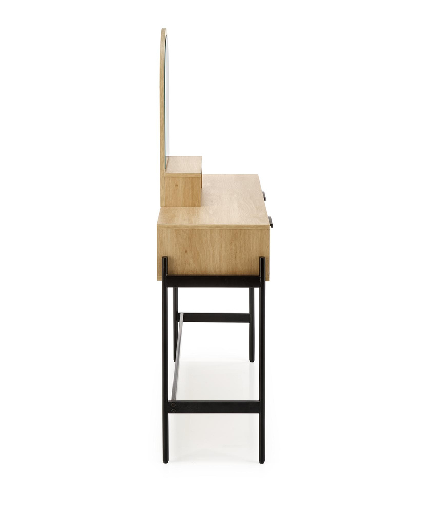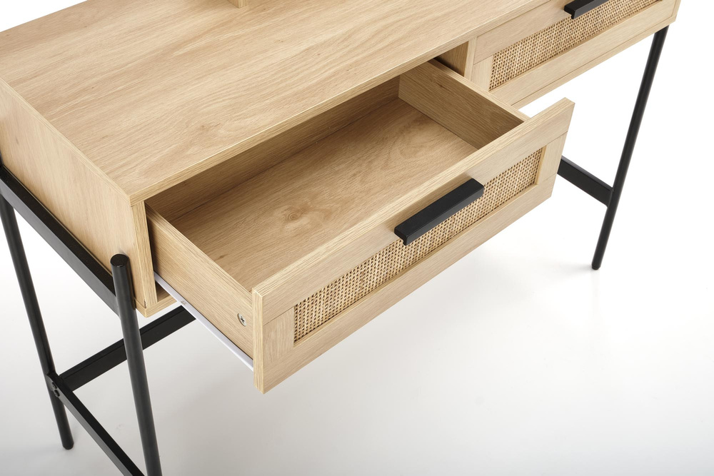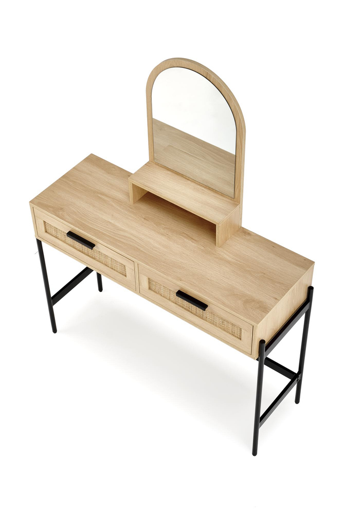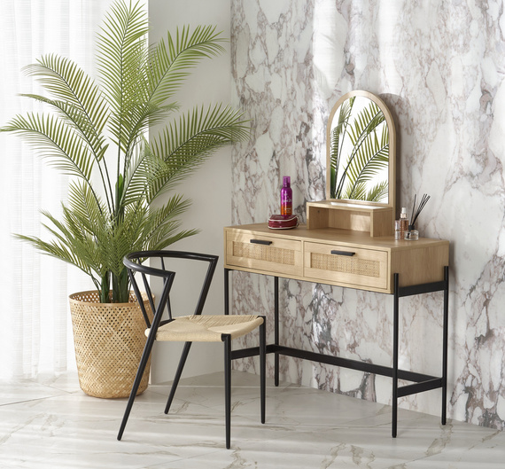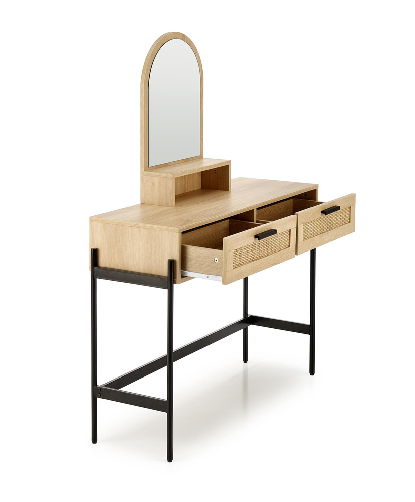 Mebel wykonano z płyty meblowej okleinowanej melaminą, wzbogaconej o fronty z naturalnego rattanu oraz solidny stelaż ze stali malowanej proszkowo. Nad blatem umieszczono lustro w eleganckiej, zaokrąglonej ramie, które optycznie powiększa przestrzeń i dodaje jej lekkości. Wymiary 104 × 35 × 136 cm zapewniają odpowiednią powierzchnię roboczą oraz miejsce do przechowywania w dwóch praktycznych szufladach.