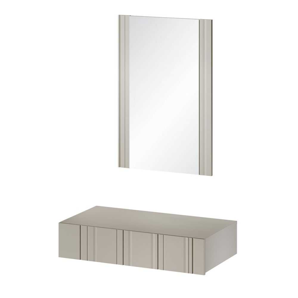 Toaletka Milo w beżowym macie to idealne połączenie nowoczesnej formy, subtelnej elegancji i praktycznego podejścia do organizacji przestrzeni. Jej kompaktowe wymiary oraz stylowe wykończenie sprawiają, że doskonale odnajdzie się zarówno w sypialni, jak i przedpokoju czy garderobie. Zestaw zawiera dopasowane lustro, które dopełnia całość i podkreśla funkcjonalność mebla.