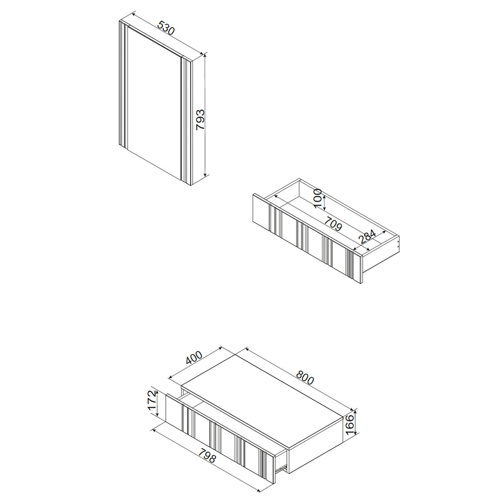 Toaletka Milo została wykonana z wysokiej jakości materiałów. Korpus powstał z płyty laminowanej o grubości 16 mm, co gwarantuje trwałość i odporność na codzienne użytkowanie. Front szuflady to płyta MDF o grubości 16 mm, zdobiona dekoracyjnymi frezami, które nadają całości lekkości i wyjątkowego charakteru. Powierzchnia w eleganckim beżowym macie świetnie komponuje się z naturalnymi barwami i teksturami. Lustro o wymiarach 53 × 79 cm również utrzymane jest w tej samej stylistyce, tworząc spójną i dopracowaną całość.