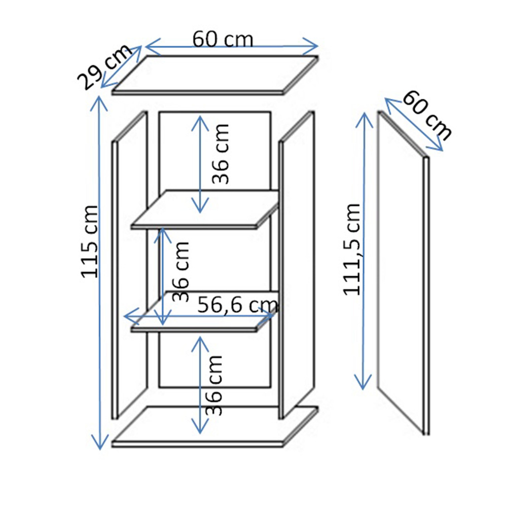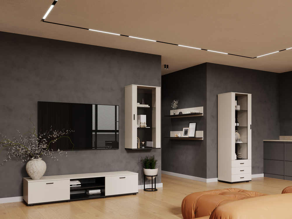 Mebel został wykonany z płyty wiórowej o matowym wykończeniu (16 mm), co nadaje mu nowoczesny, a zarazem trwały charakter. Czarne detale oraz uchwyty z tworzywa sztucznego dodają całości graficznego kontrastu. Wnętrze witryny skrywa dwie szklane półki, które można podkreślić opcjonalnym oświetleniem LED, tworząc nastrojową ekspozycję.